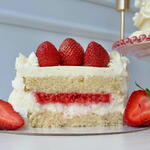 Мука,Сахар.яйца,сливки,творожный сыр, крахмал , цедра,сок,лимона,пюре клубники,краситель пищевой.