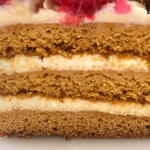 Состав: мука, Сахар, яйца, мёд, сода, сливочное масло, творожный сыр, маскарпоне, белый шоколад, сливки, клубника, голубика