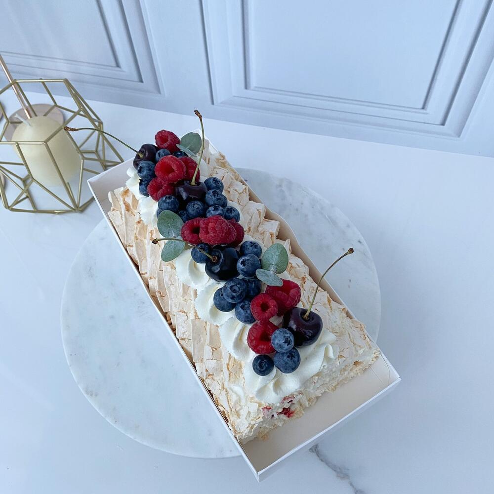 Меренга:Белок, сахар, кукурузный крахмал Крем: сыр маскарпоне, сахарная пудра, сливки Начинка: ягодный микс (малина, клубника , ежевика , смородина)