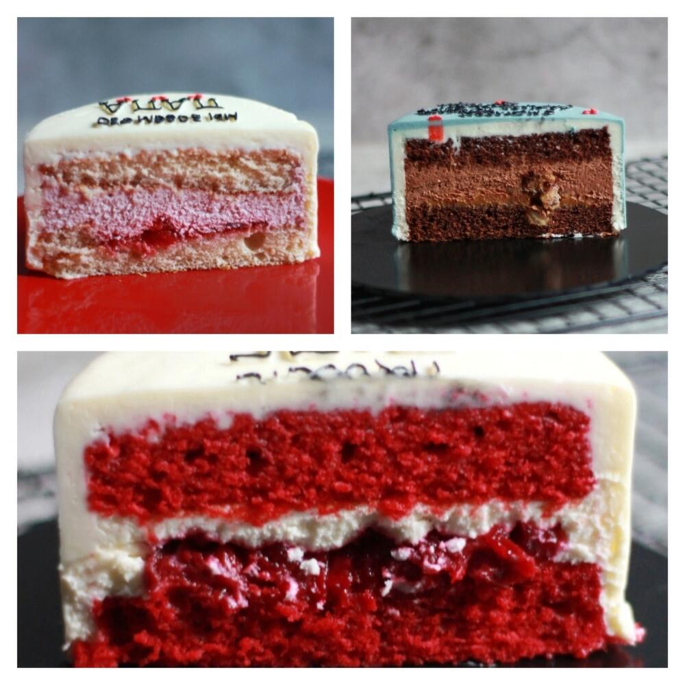 Три варианта начинки: Ягодный йогурт - йогурт греческий, яйцо куриное, мука пшеничная, сахар, сливки 33%, сыр творожный, масло сливочное 82,5%, масло растительное, пюре ягодное (малина, клубника), клубника замороженная, пектин, желатин, разрыхлитель Вишневый бархат - мука пшеничная, яйцо куриное, сахар, масло сливочное, масло растительное, кефир, сыр творожный, вишня б/косточки, крахмал кукурузный, какао, экстракт ванили, разрыхлитель, сода, краситель пищевой Шоколадное мороженое - мука пшеничная, сахар, яйцо куриное, молоко коровье, масло сливочное, масло растительное, какао, шоколад темный, сливки 33%, сыр творожный