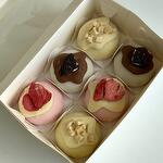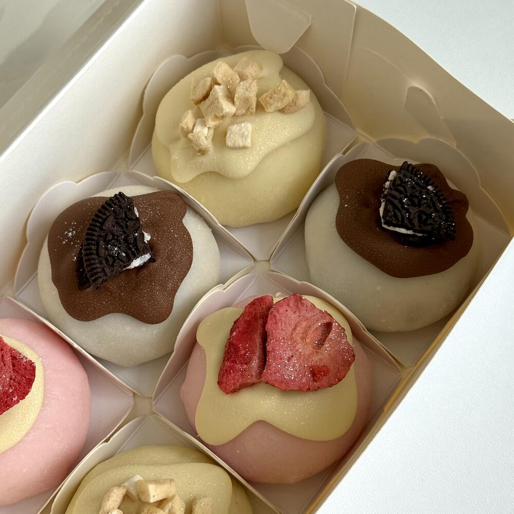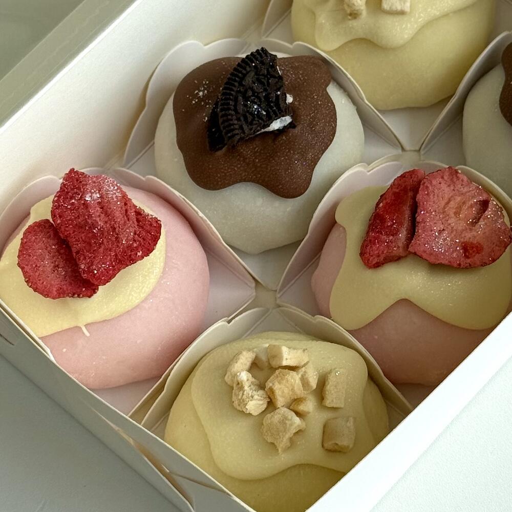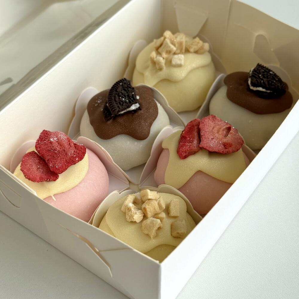 1. Начинка манго-маракуйя Состав: сливки, пюре манго, белый шоколад, пюре маракуйя, сахар, пектин nh, желатин, сублимированный манго. 2. Начинка клубника со сливками Состав: сливки, пюре клубники, белый шоколад, сахар, пектин nh, желатин, сублимированная клубника. 3. Начинка орео Состав: белый шоколад, печенье орео, сливки, молоко, желатин, молочный шоколад. Состав теста: вода, клейкая рисовая мука, сахарная пудра, растительное масло