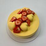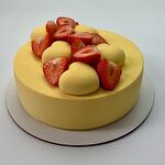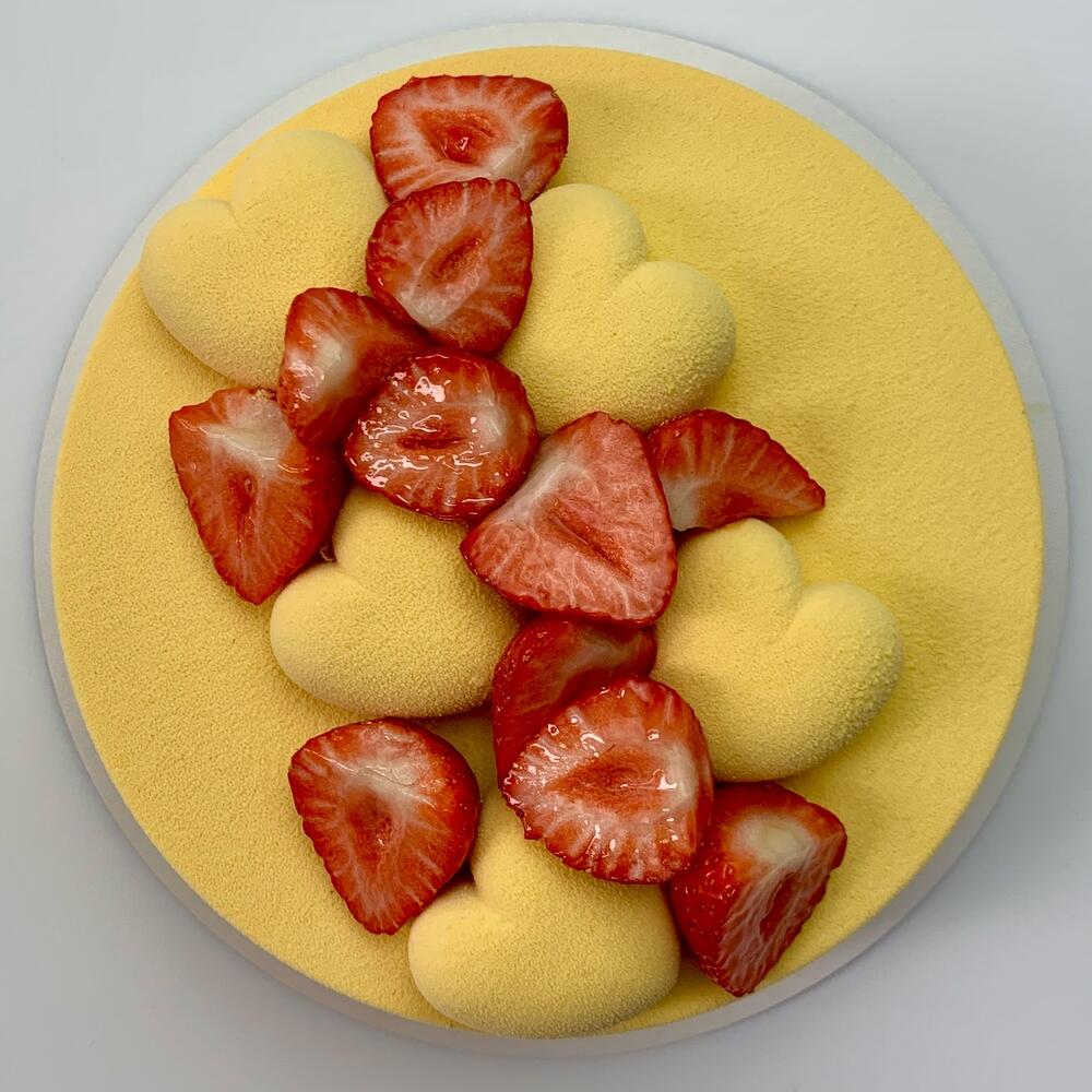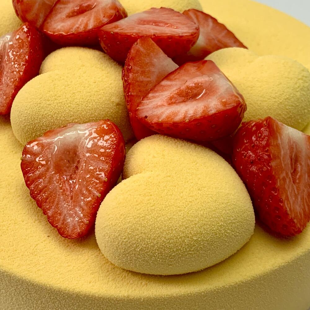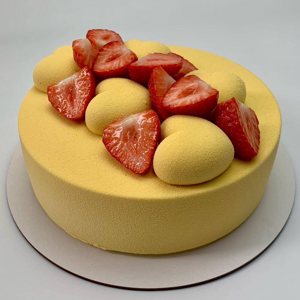Муссовый торт с жёлтым велюром, сердцами и клубникой