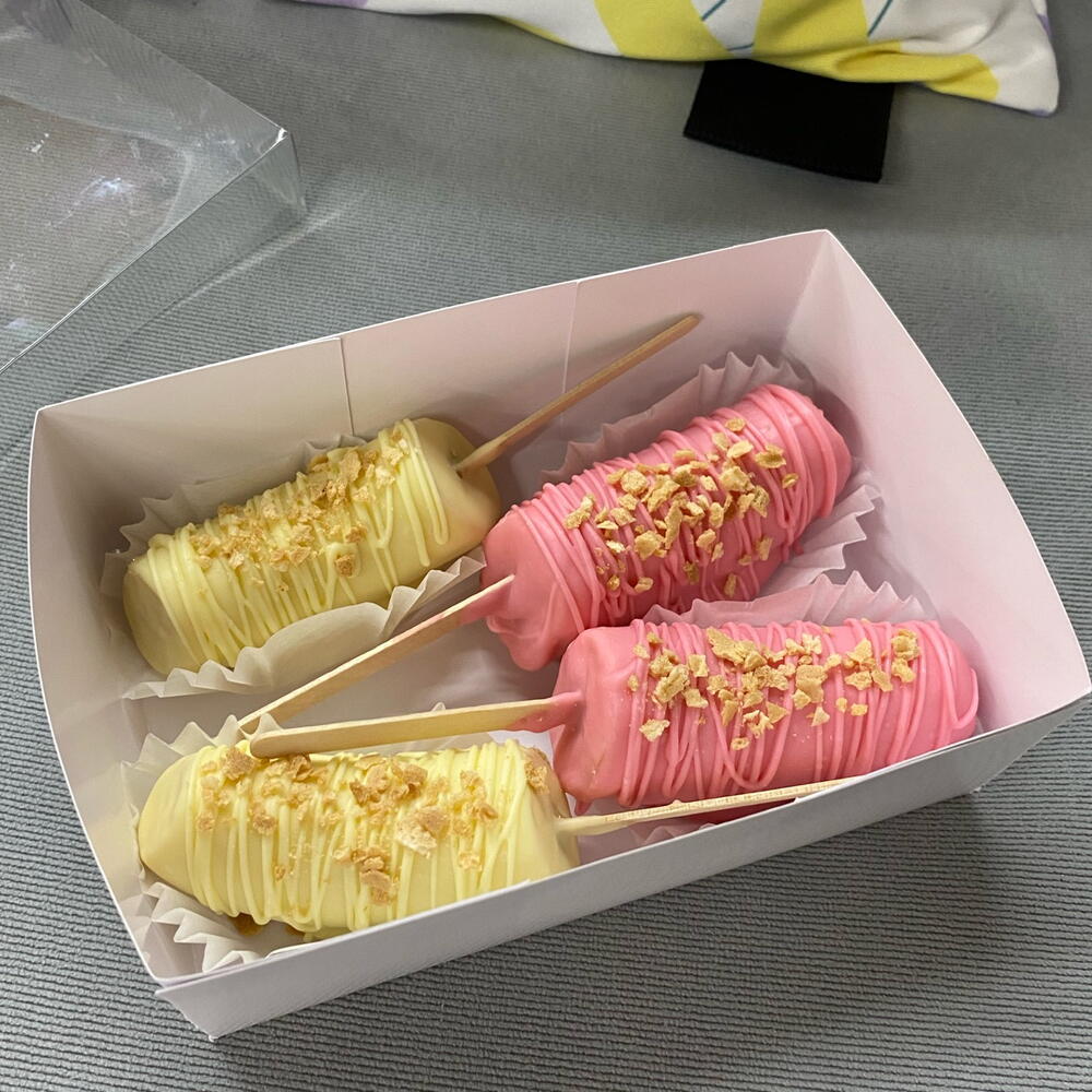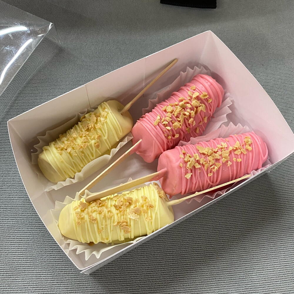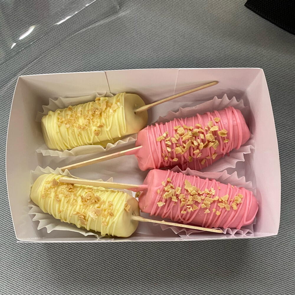 Свежие бананы, сахар, масло какао, сухое цельное молоко, какао тертое, эмульгатор: соевый лецитин, натуральный ароматизатор: ваниль Посыпка: вафельная крошка