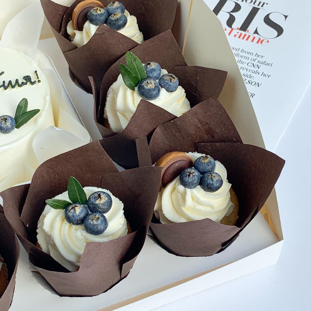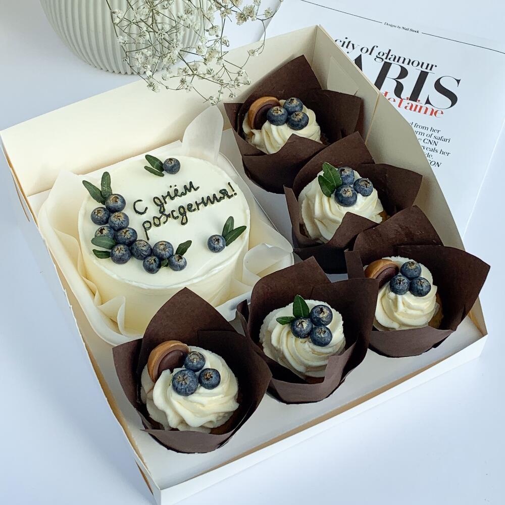 Набор бенто и 5 капкейков с голубикой на день рождения "С днем рождения" коллеге в офис, мужу, подруге, другу