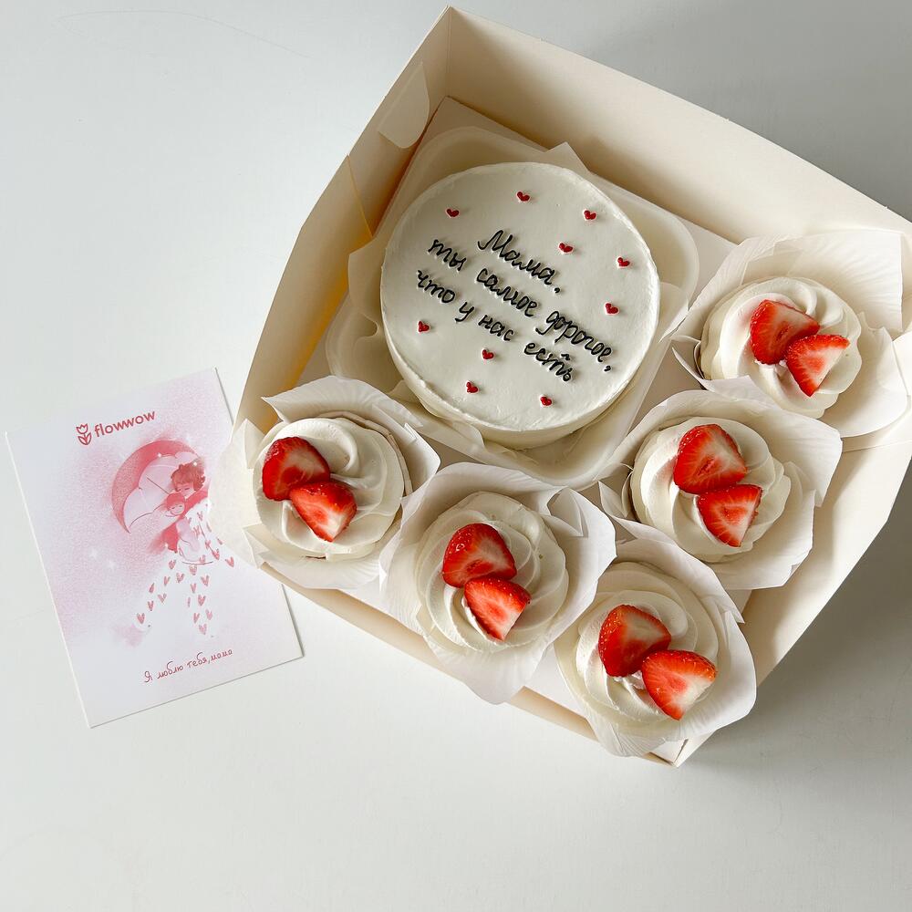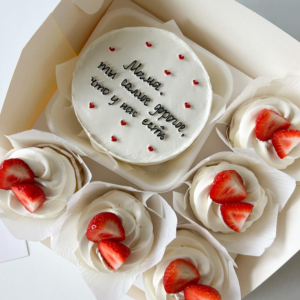 Набор бенто торт и 5 шт капкейков в подарок маме, жене🤍 Начинка на выбор (по умолчанию идет ваниль/клубника): 1. Ваниль/клубника или черная смородина : ванильные бисквиты, кремчиз , клубничная начинка или из черной смородины 2. Шоколад/карамель арахис: шоколадные бисквиты, кремчиз, карамель арахис Срок годности 72 ч С заботой, VolkPie