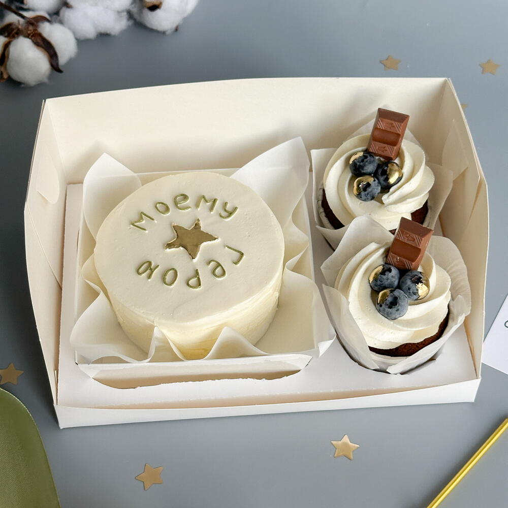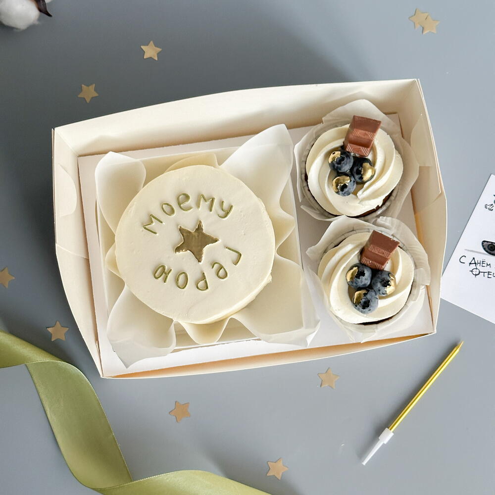 Подарочный набор бенто и 2 капкейка для вашего защитника - идеальный повод сказать о своих чувствах к нему. Отличный подарок на 23 февраля День Защитника Отечества, день рождения и любой другой повод. Такой набор удобно взять с собой на пикник, фотосессию, прогулку и праздник. Ведь в комплекте вы найдете свечку, ложечку, праздничную упаковку и при желании можно добавить тематическую открытку. Торт и капкейки изготовлены полностью из натуральных ингредиентов, в т.ч. сливочный крем для торта. Набор упакован в коробку и надежно перевязан лентой, а также дополнен свечкой и конфетти. Вес торта 350-400 гр Идеален для 2-3 человек Оформление на ваш вкус. ВАЖНО: - Яркие цвета крема (красный, синий, черный и др.) могут окрасить ваши губы, зубы и руки. Не переживайте, это ненадолго. Пищевой краситель обязательно отмоется. - Срок хранения моих бенто и капкейков ограничен, так как я использую только качественные натуральные ингредиенты не более 72 суток в холодильнике при температуре от +3 до +5 в коробке или герметичном контейнере.
