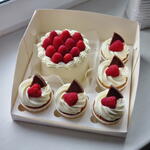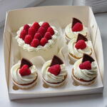 Набор бенто и 5 капкейков со свежей малиной. Бенто 2 самых популярных вкуса, капкейки ванильные с клубникой или шоколадные с карамелью на выбор.