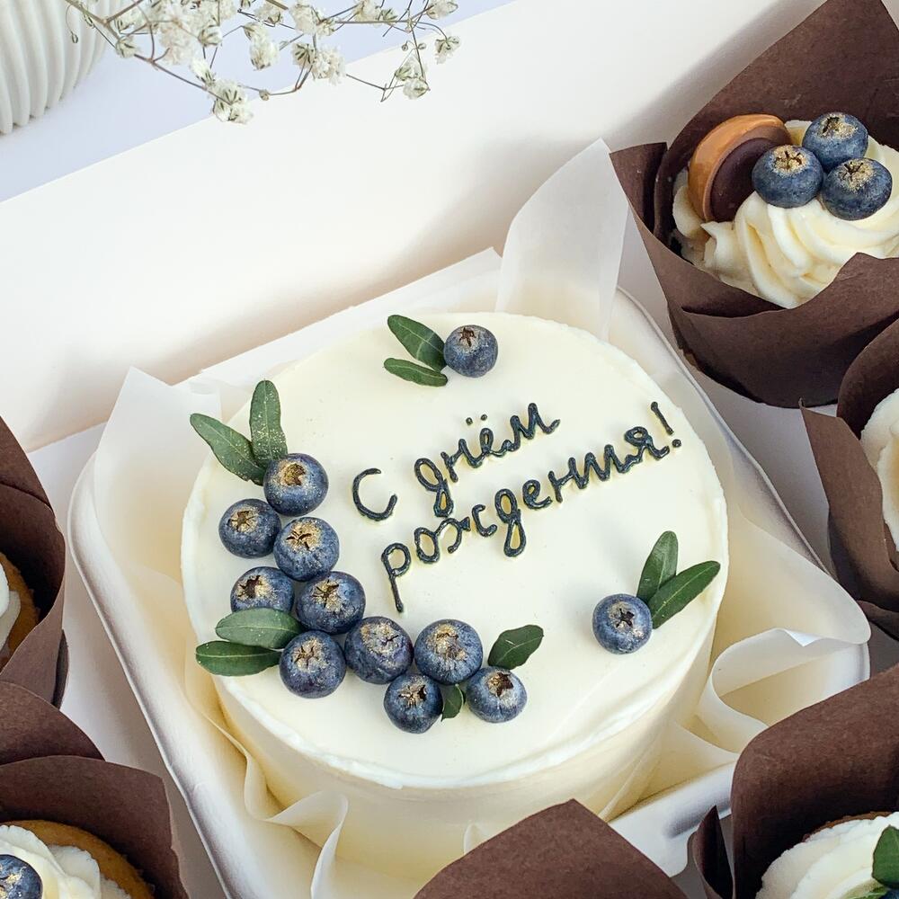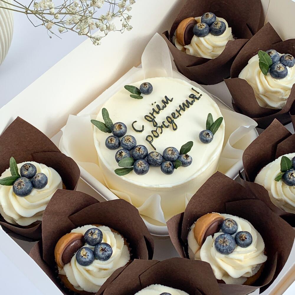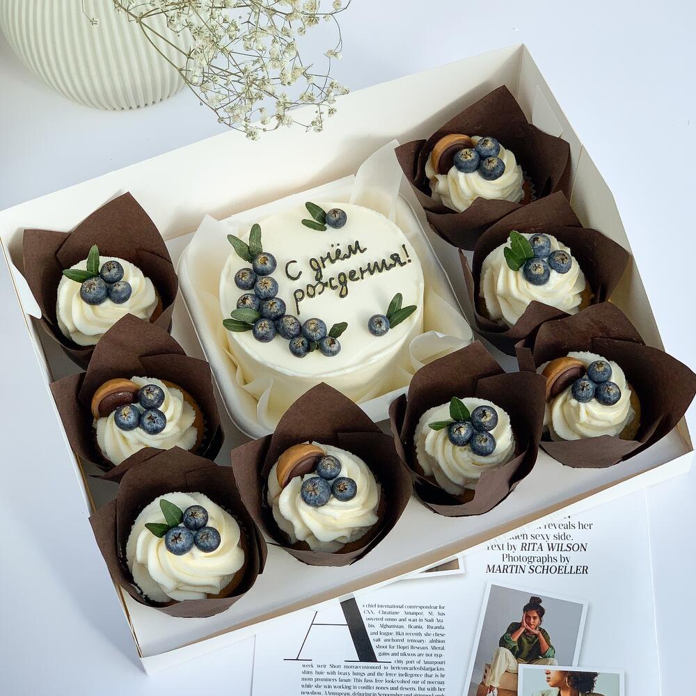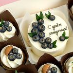 Набор большой бенто и капкейки/маффины/кексы с голубикой 8 шт. "С днем рождения!" в офис коллегам на корпоратив