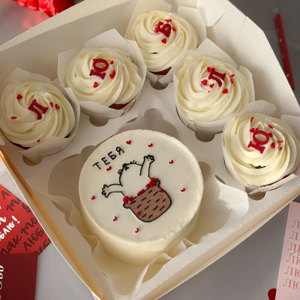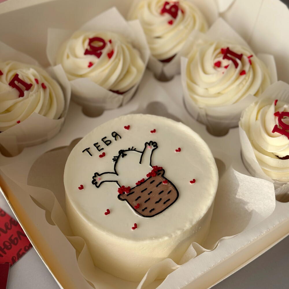 Скажите «Люблю тебя » самым сладким и творческим способом🥰 Главный посыл спрятан между уютным бенто-тортом и пятью нежными капкейками. Кот в корзинке уже приготовил сердечки и начал фразу. Продолжите её за общим столом — это станет вашей милой традицией❤️