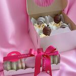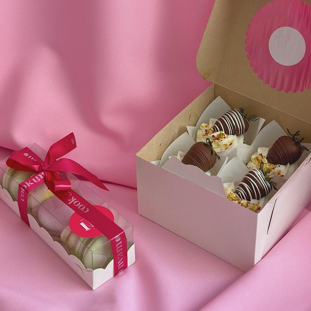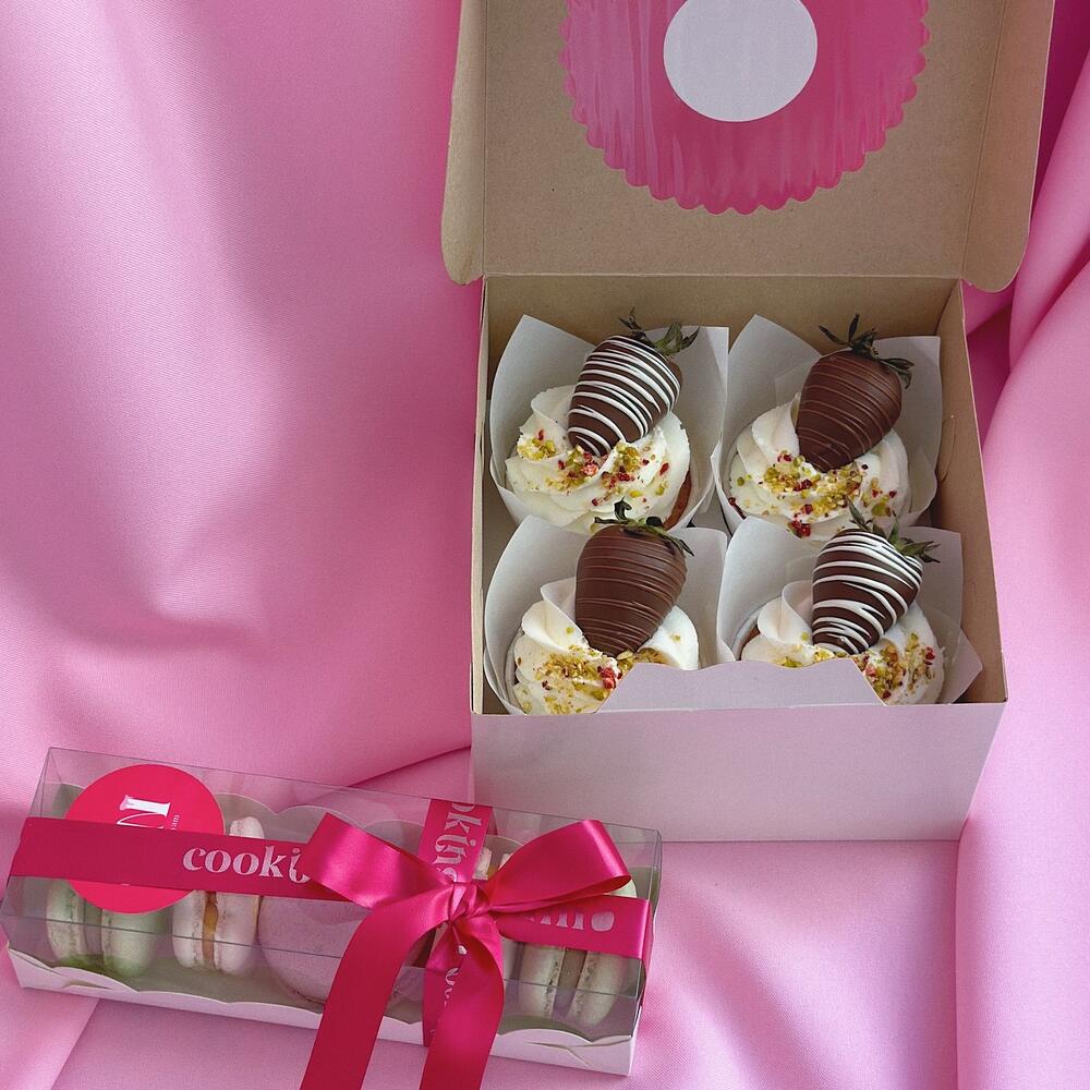 Ванильные капкейки Сливочное масло 82,5%, яйца,сахар, ванильный сахар, разрыхлитель, соль, молоко, мука Ягодная начинка Крем чиз Творожный сыр, сливки натуральные 33%, сахарная пудра Ягоды клубники в шоколаде Макаруны ассорти ( могут отличаться от представленных : черная смородина, манго -маракуйя , клубника, фисташка, шоколад