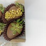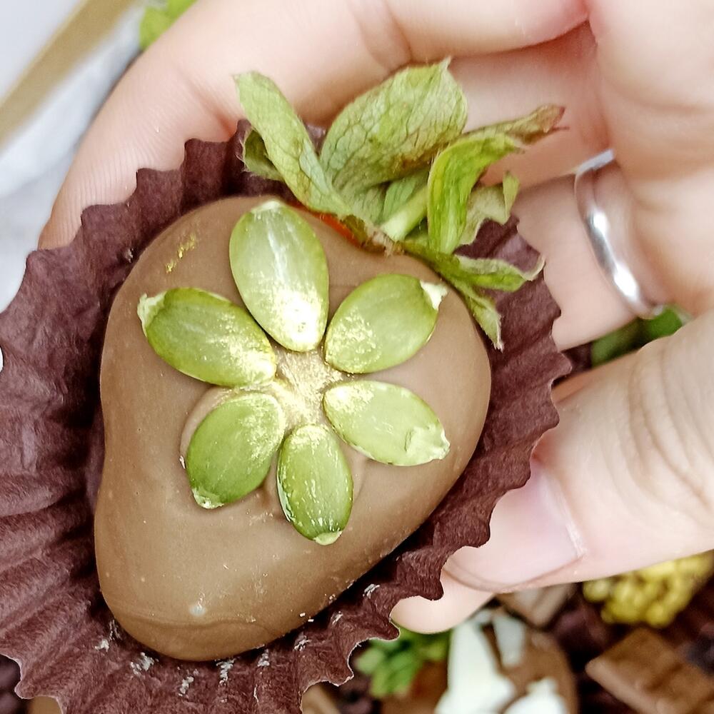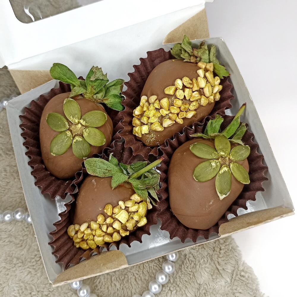 Клубника 36 шт Шоколад молочный Bаrry Callebaut, масло, какао, сухое цельное молоко, какао тертое, эмульгатор: соевый лицетин, ароматизатор: натуральный ваниль. Топпинги: Дутый рис Кандурин Семена тыквы Упаковка: Упаковочная бумага Лента атласная Наклейка фирменная Визитка с инструкцией
