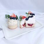 Сливочные капкейки с клубникой: Сахар, яйца, сливочное масло, греческий йогурт, разрыхлитель, мука пшеничная, шоколад белый, ванилин, клубничное пюре, пектин NH, лимонная кислота, сливочный творожный сыр, сахарная пудра, сливки, пищевые красители в декоре цветы. Декор: в несезон клубники голубика и/или мармеладные малинки, зелень фисташка.