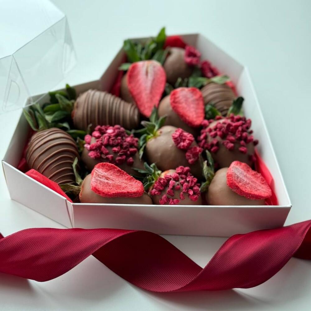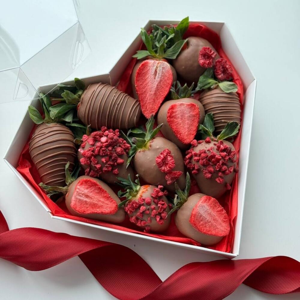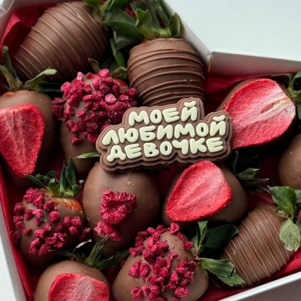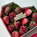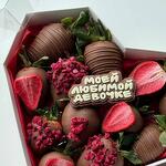 Набор клубники в бельгийском шоколаде, украшенный сублимированной клубникой и малиной в коробке в форме граненного сердца, с шоколадной надписью моей любимой девочке. Подойдёт для подарка любимой девушке, жене на любой повод