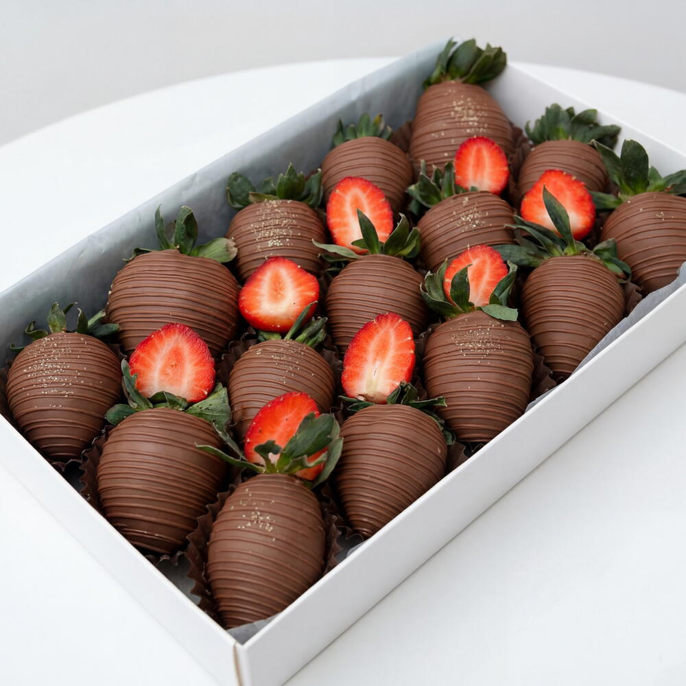 Подарите незабываемые эмоции и эстетическое наслаждение! Наш набор — это идеальное сочетание отборной, крупной садовой клубники и премиального бельгийского шоколада. Каждый десерт создается вручную непосредственно перед доставкой, чтобы вы получили максимально свежий и ароматный продукт. Свежайшая клубника: Мы используем только сладкие сорта с плотной текстурой. Премиальный шоколад: Нежный бельгийский молочный шоколад с бархатистым вкусом. Срок хранения клубники в шоколаде составляет 24 часа при температуре от +2 до +10°C. Мы рекомендуем насладиться десертом в первые 12 часов после покупки, чтобы ощутить всю полноту вкуса свежей ягоды. Перед употреблением рекомендуем подержать 15 минут при комнатной температуре для более мягкого вкуса шоколада. Упаковка: Набор доставляется в стильной белой корочке с прозрачным окном, перевязанной атласной лентой. Дополнительно бережно упаковываем в крафт-пакет для безопасной транспортировки.