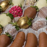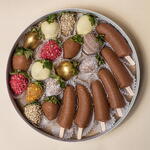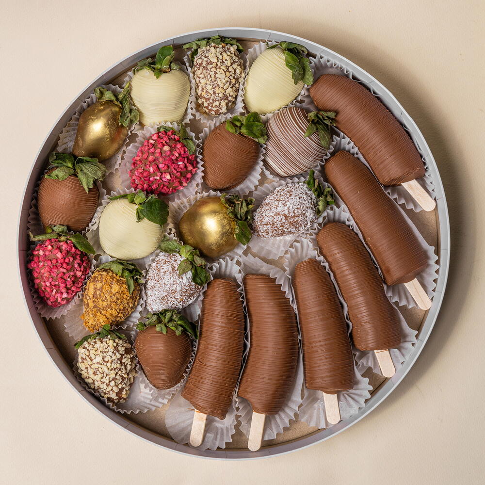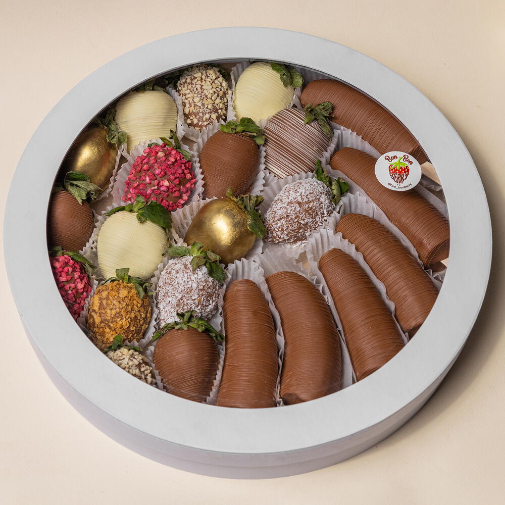 Клубника свежая - 16 шт. Банан - 5 шт. Шоколад молочный Callebaut: какао-масло, тертое какао, сухое цельное молоко, сахар, натуральные лецитин и ваниль. Шоколад белый Callebaut: какао-масло, тертое какао, сухое цельное молоко, сахар, натуральные лецитин и ваниль. Сублимированная малина, жареный арахис, кокосовая стружка, кандурин и вафельная крошка.