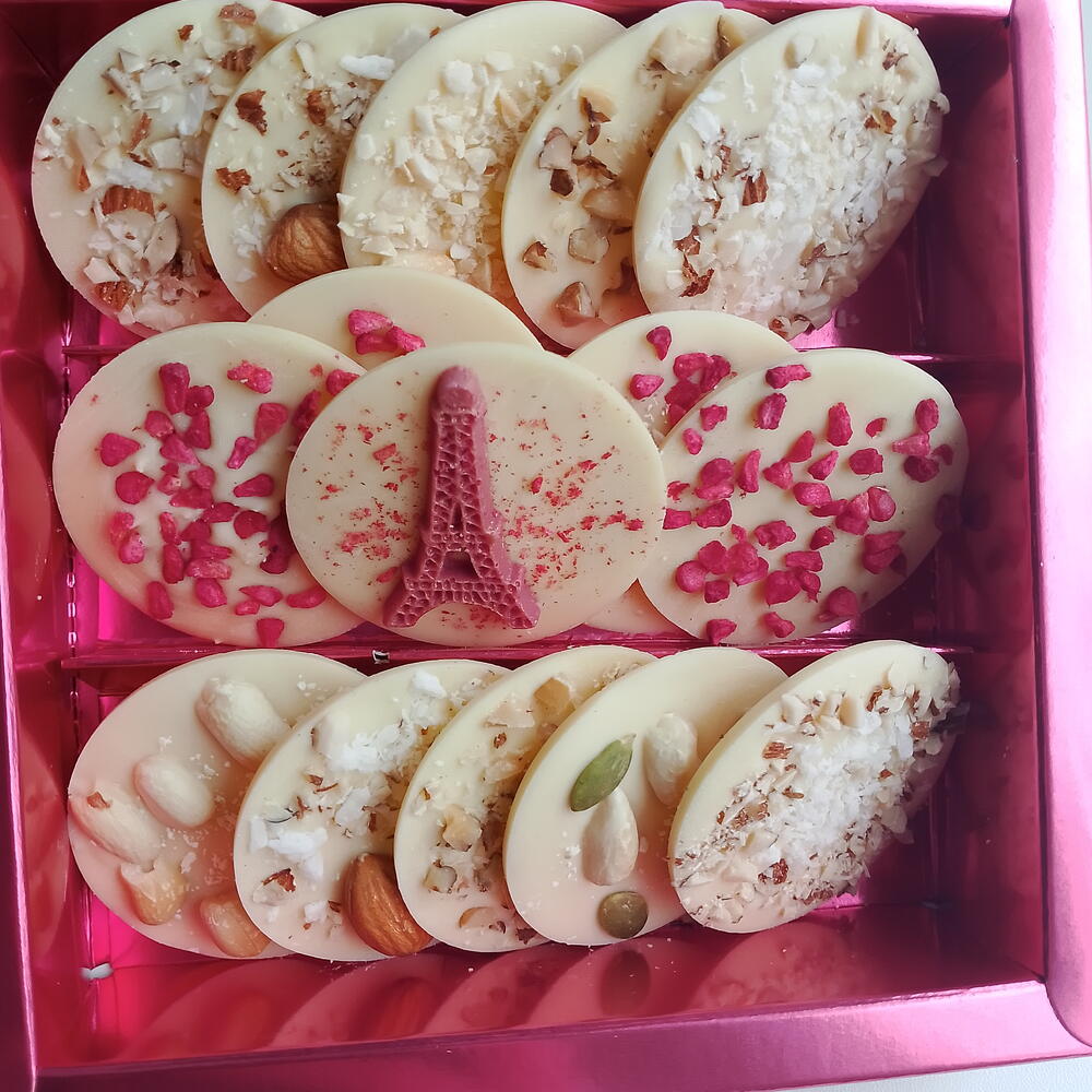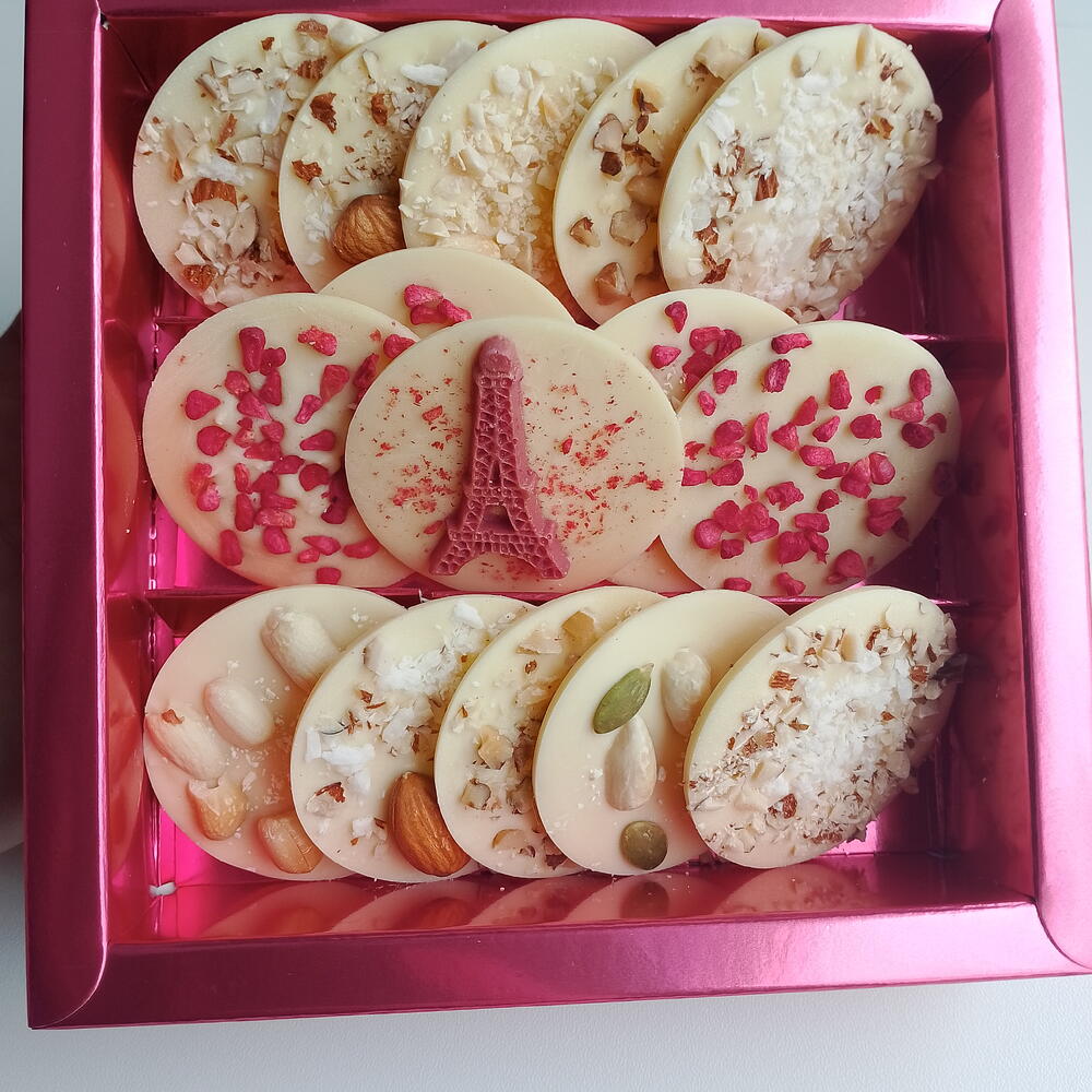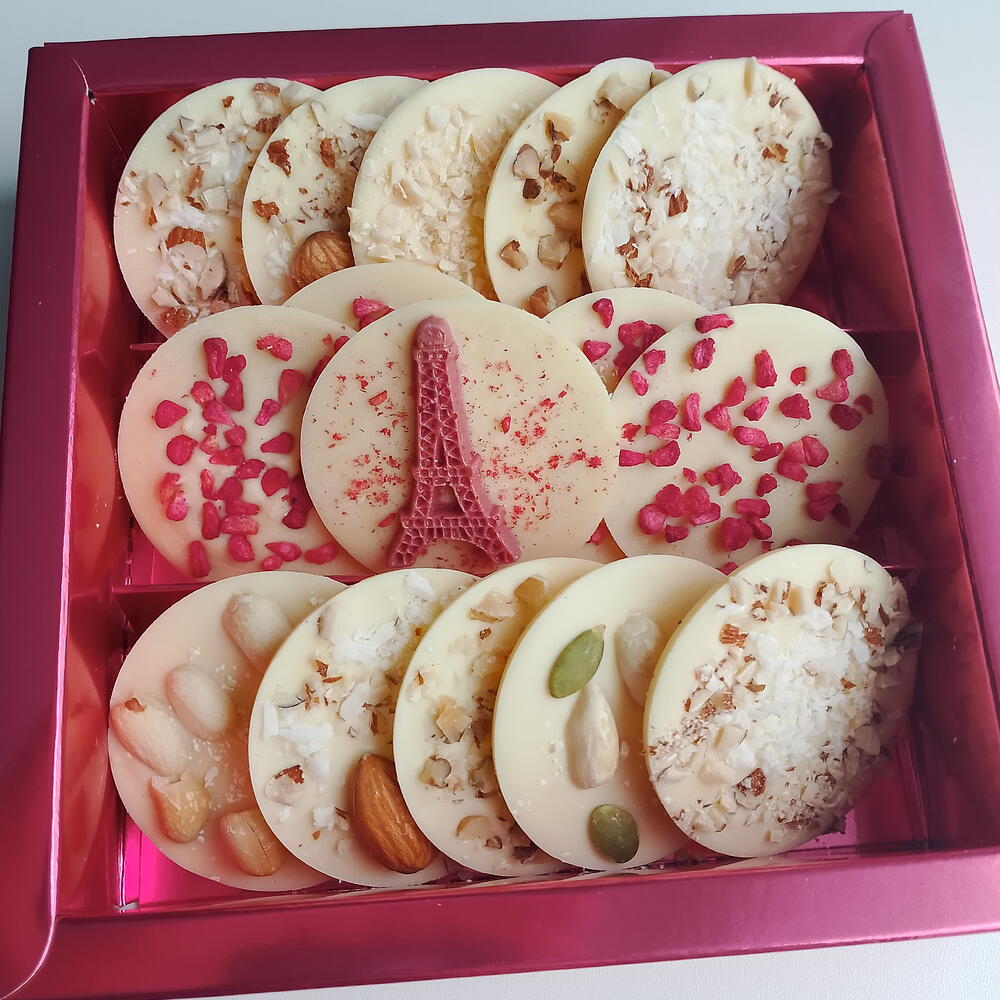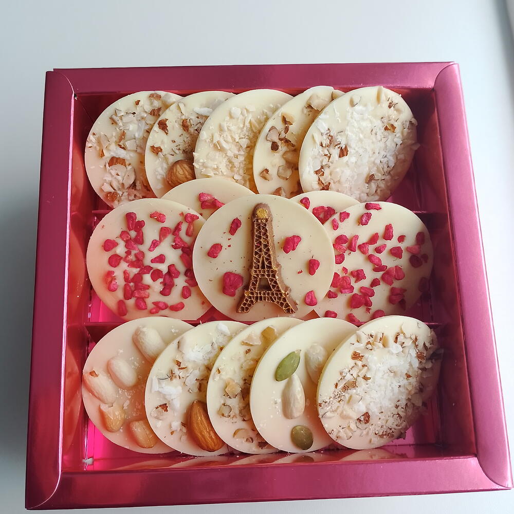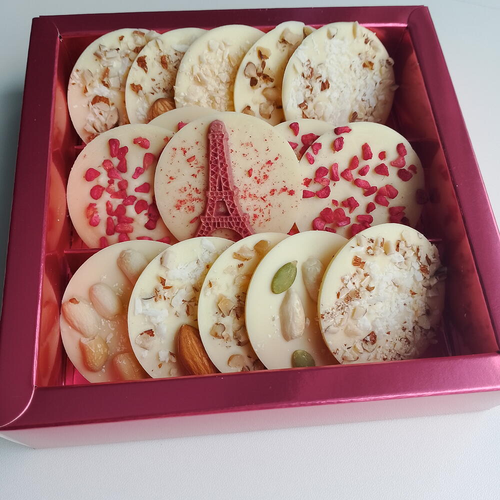 Бельгийский белый шоколад с сублимированной малиной и орехами. Медианты - 15 шт. Подарок, презент, комплимент на 8 марта. Рекомендуем хранить шоколадные изделия при 12-20°С, влажности воздуха не более 70%, в чистом и сухом месте без посторонних запахов. Срок годности: 6 месяцев. По количеству нужных наборов, пишите нам в чат. Всё подготовим! Принимаем заказы на корпоративные подарки. Приятных покупок!