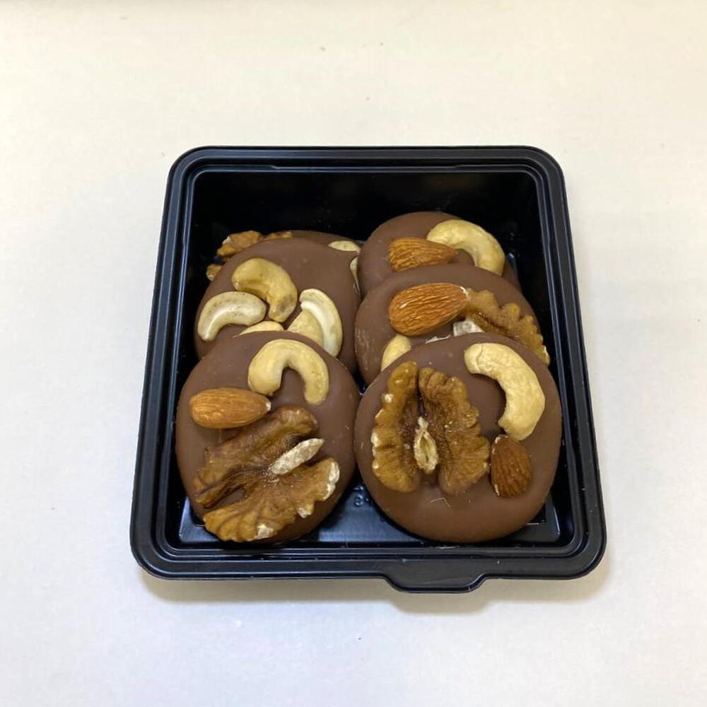 Грецкий орех, кешью, миндаль, сахар, масло какао, сухое цельное молоко, какао тертое, эмульгатор: соевый лецитин, натуральный ароматизатор: ваниль.