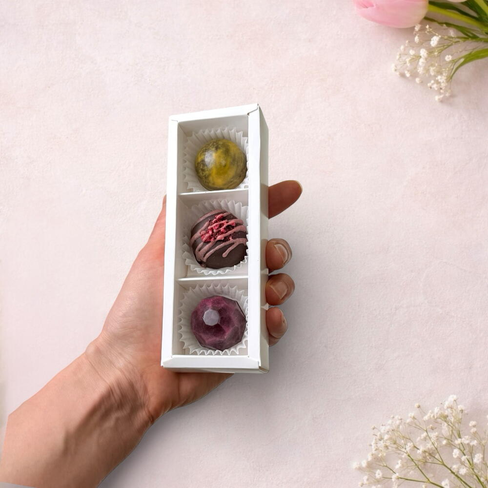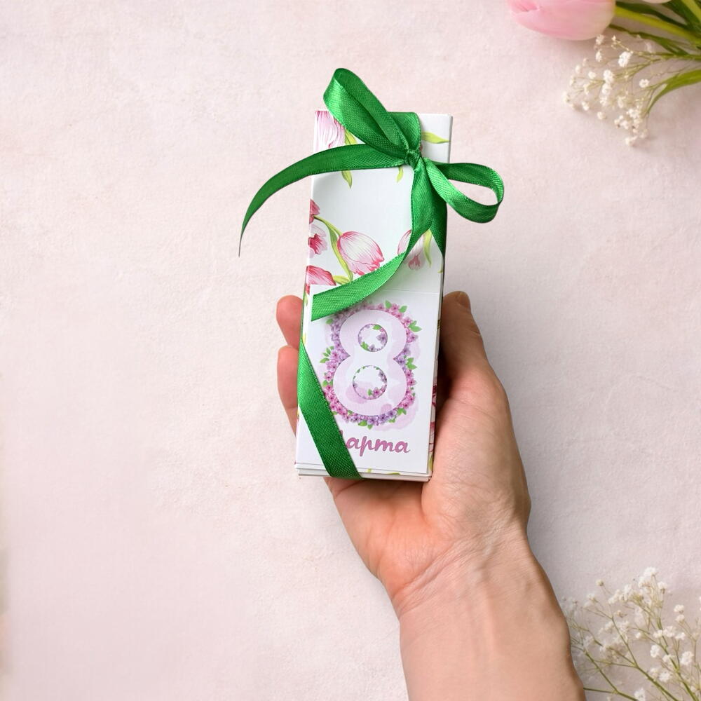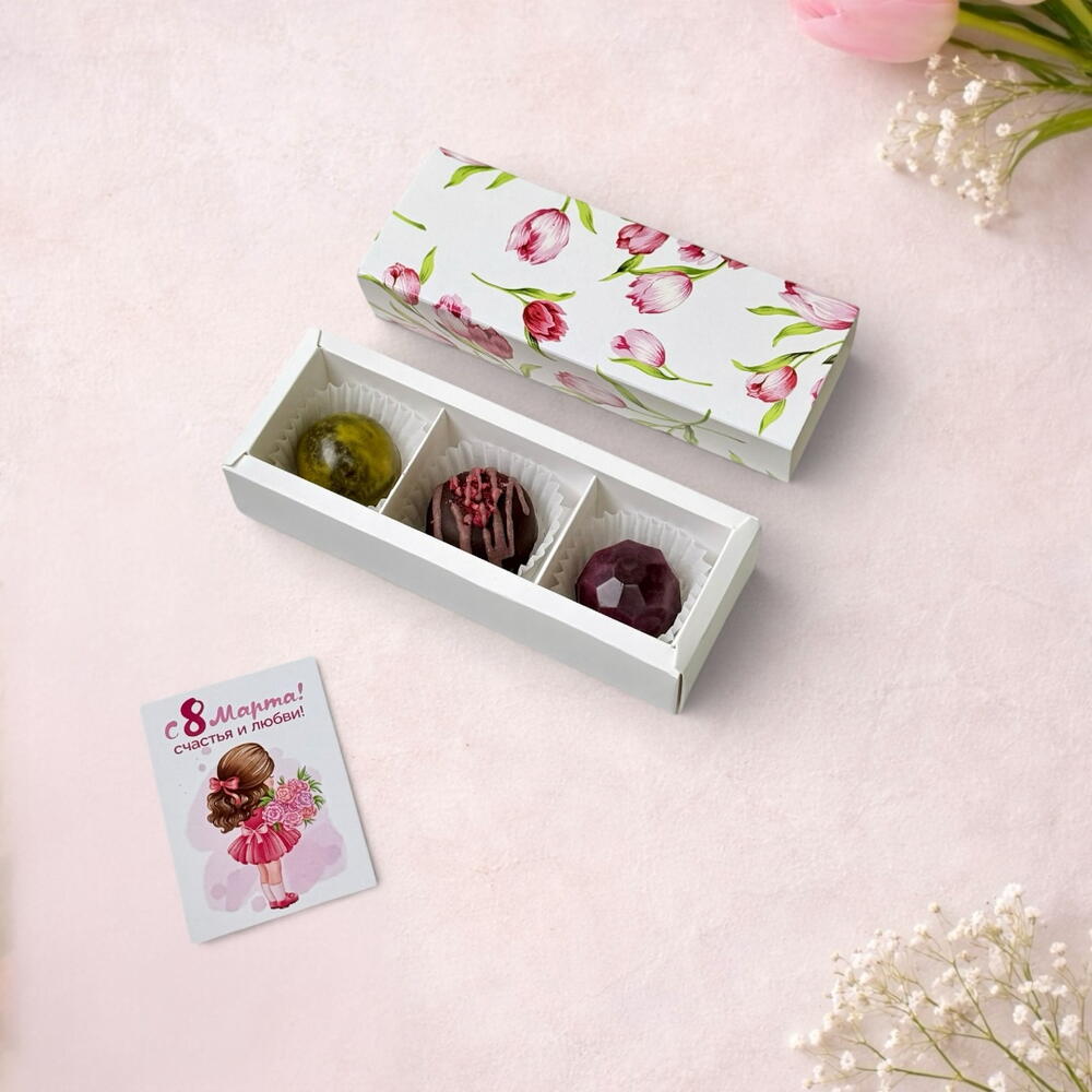 Подарочный набор на 3 конфеты - небольшой комплимент, чтобы оказать знак внимания и соблюсти традиции. Когда нужно сделать несколько одинаковых подарков за разумную стоимость, например, для поздравления коллег в коллективе, или одноклассниц в школе. Внутри ассорти из 3 самых любимых вкусов: грильяж, клубника-сливки и шоколадная карамель. Формат ассорти — самый удачный для подарка: он даёт выбор, интерес и удовольствие от дегустации. Все конфеты очень вкусные, поэтому подарок запоминается. Нарядная коробка с нежными тюльпанами ассоциируется с весной и 8 марта. Коробка перевязана зелёной лентой и дополнена открыткой 5*7 см, чтобы вы могли добавить личное поздравление.