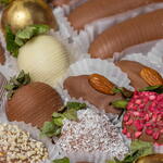 Клубника свежая - 16 шт. Финик - 6 шт. Банан - 4 шт. Шоколад молочный Callebaut: какао-масло, тертое какао, сухое цельное молоко, сахар, натуральные лецитин и ваниль Шоколад белый Callebaut: какао-масло, тертое какао, сухое цельное молоко, сахар, натуральные лецитин и ваниль Сублимированная малина, жареный арахис, кокосовая стружка, кандурин и вафельная крошка