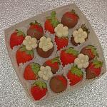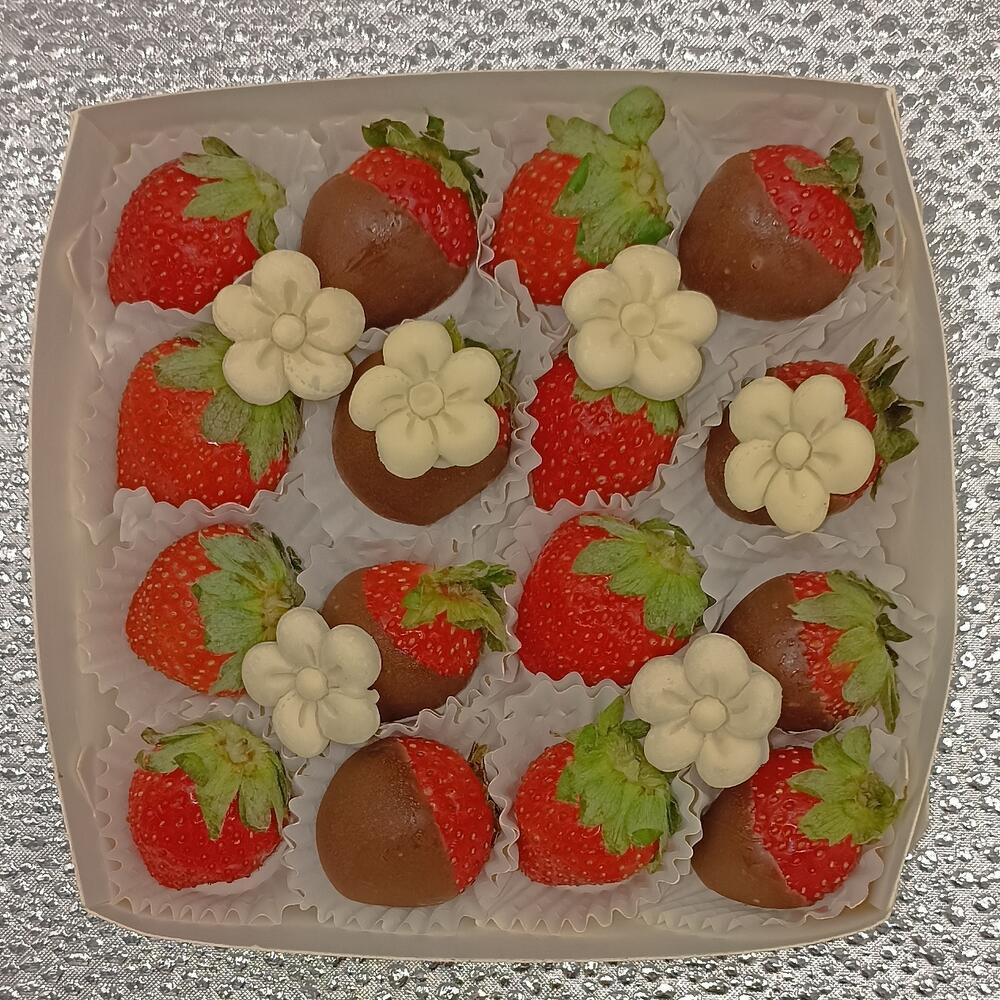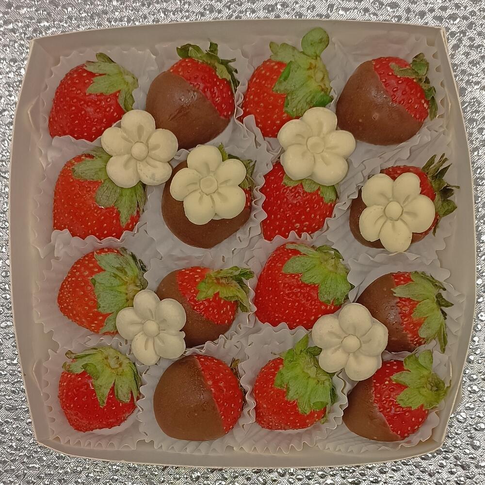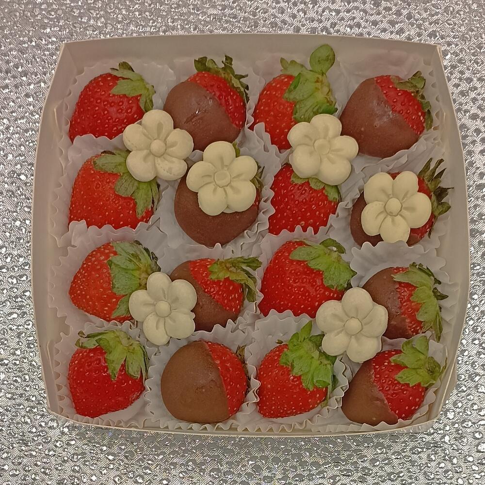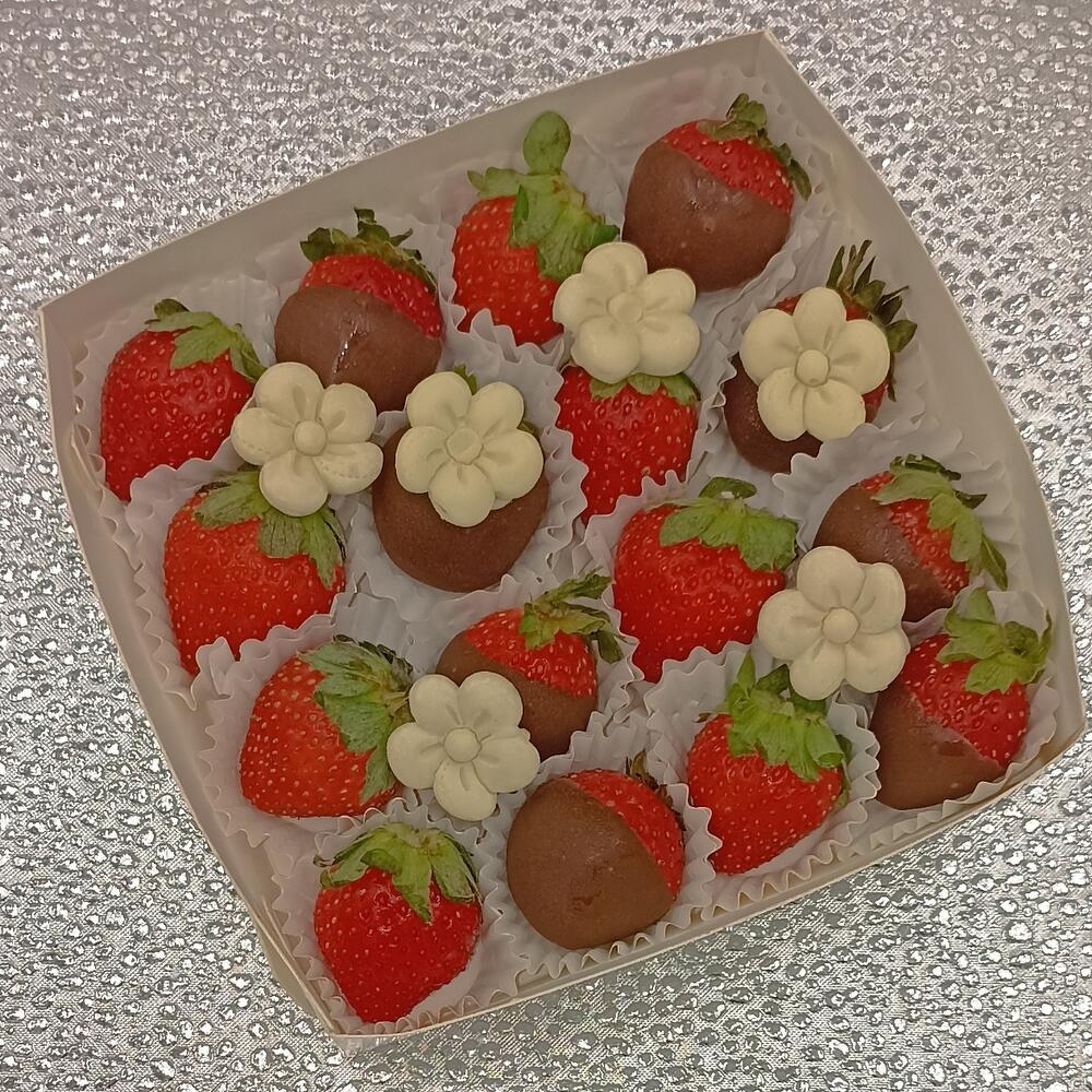 Некрупная сезонная клубника в коробке. Клубника свежая 8 шт. Клубника в молочном шоколаде 8 шт. Декор : цхветочки из белого шоколада 6 шт.