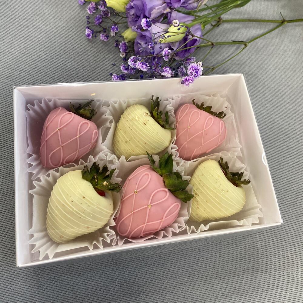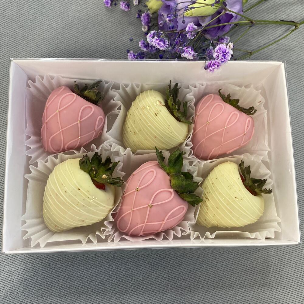Сладкий поцелуй нежности Изысканный набор свежей клубники, покрытой нежнейшим белым и розовым шоколадом. Идеальное сочетание вкуса и эстетики для признания в чувствах, нежного сюрприза или сладкого повода улыбнуться.