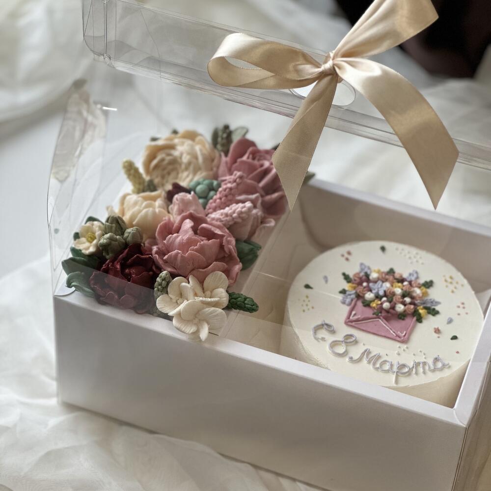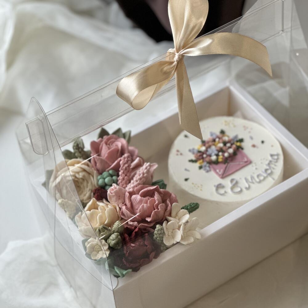 Надпись или рисунок на самом торте можно сделать по вашему запросу👩🏻🍳 Уникальный подарочный набор ручной работы: - зефирная флористика ручной работы - бенто торт весом в 1 кг Подарочная упаковка премиум сегмента. Данный подарок подчеркнет важность и трепетность ваших чувств к адресату.
