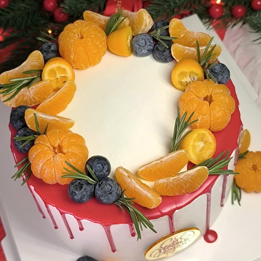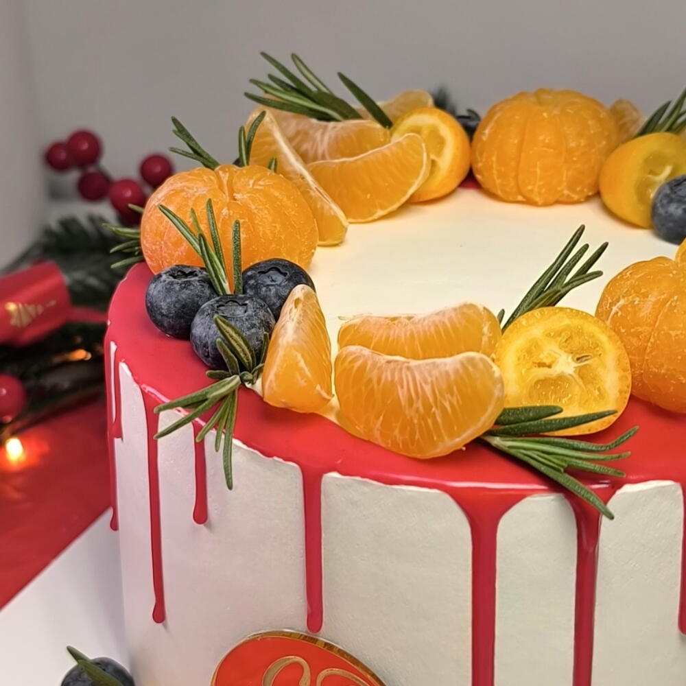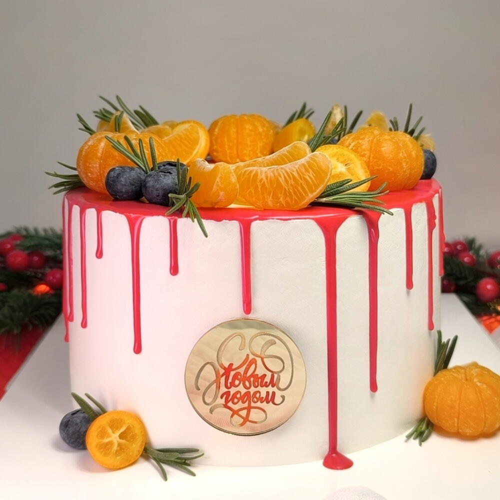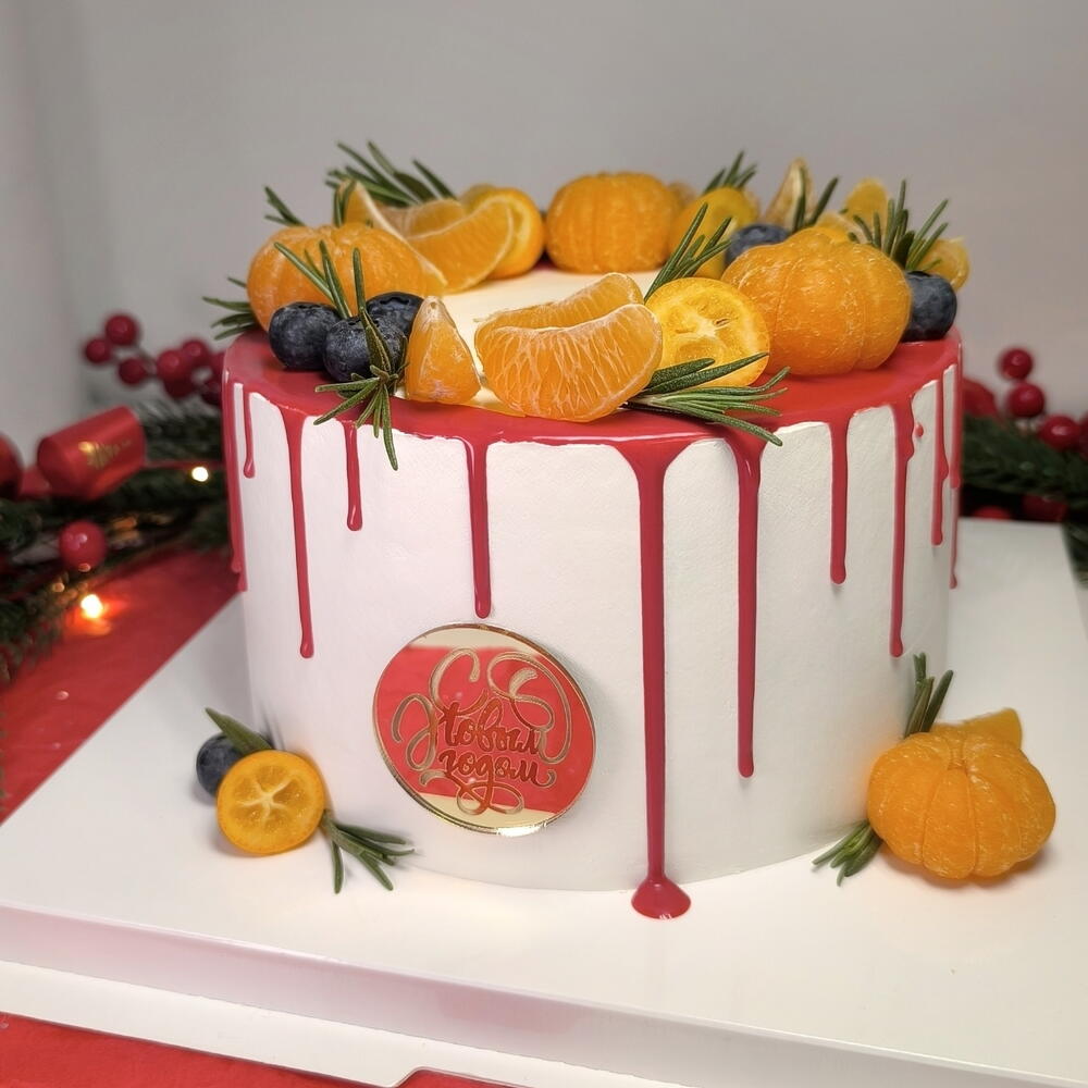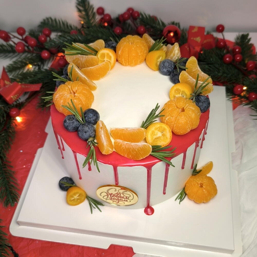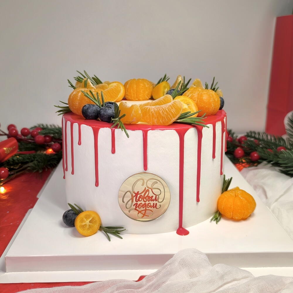 Яркий праздничный торт станет украшением любого стола 😍 Украшен подтёками из белого шоколада, мандаринами, ягодами голубики, кумватом и веточками розмарина, в центре торта табличка С Новым годом - можно заменить на другую тематическую (большое разнообразие в наличии) или совсем убрать Вес торта без декора 1.5 кг А праздничная упаковка сделает этот торт идеальным подарком: премиальная коробка с прозрачным куполом, атласная лента, мини открытка, конфетти и картонный подарочный пакет