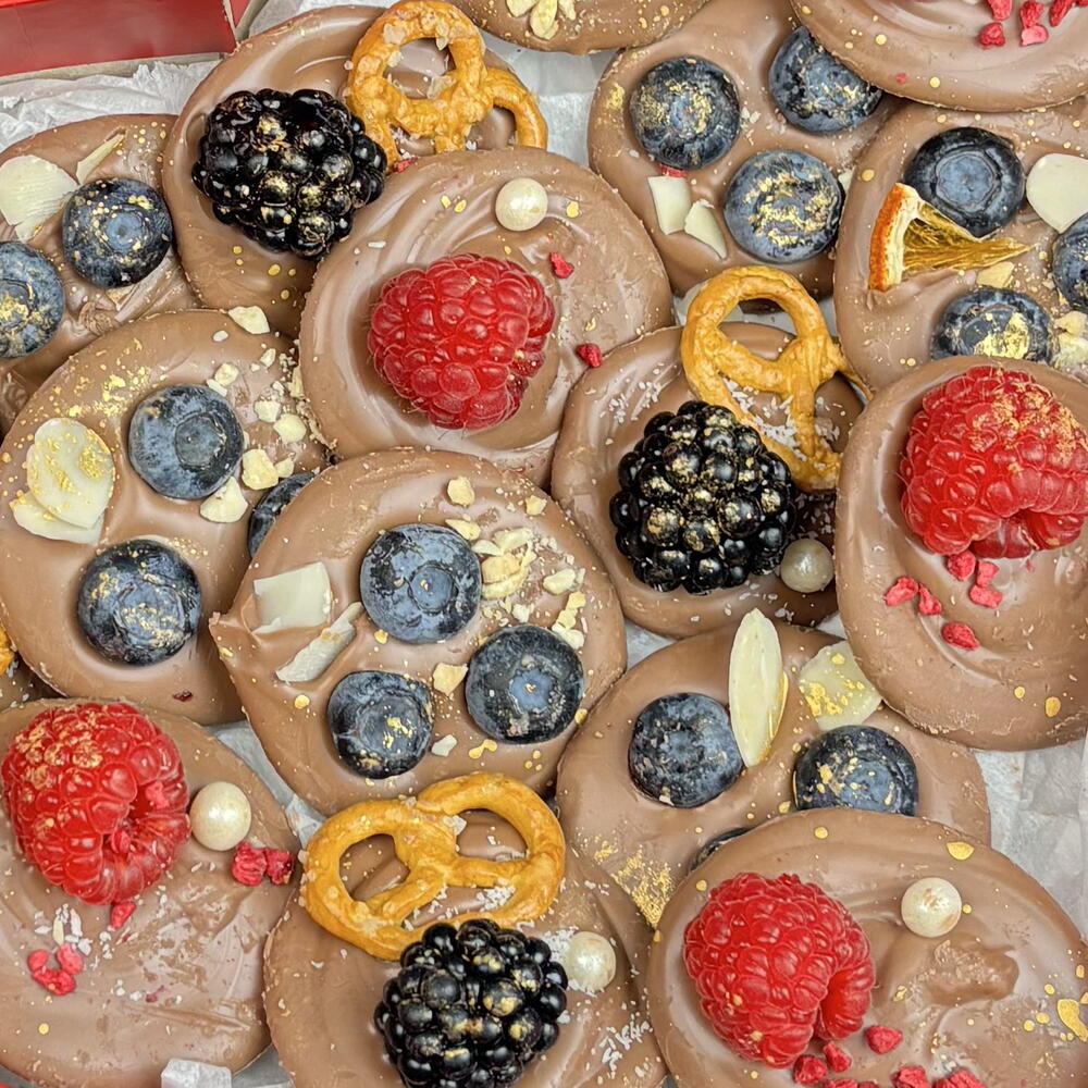 Молочный шоколад ручной работы с малиной, сублимированной малиной, сахарной посыпкой, ежевикой, кокосовой стружкой, соленым кренделем, голубикой, миндальными лепестками, ореховой посыпкой. Очень вкусный и красивый подарок.