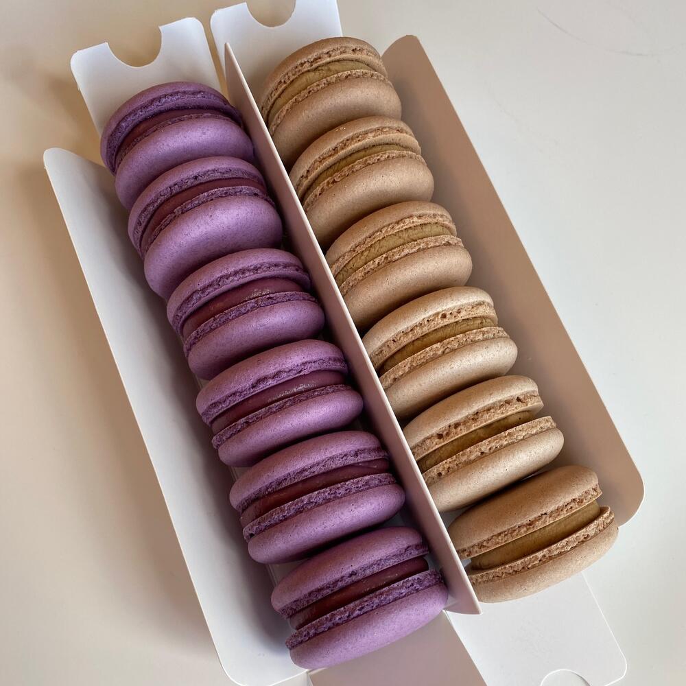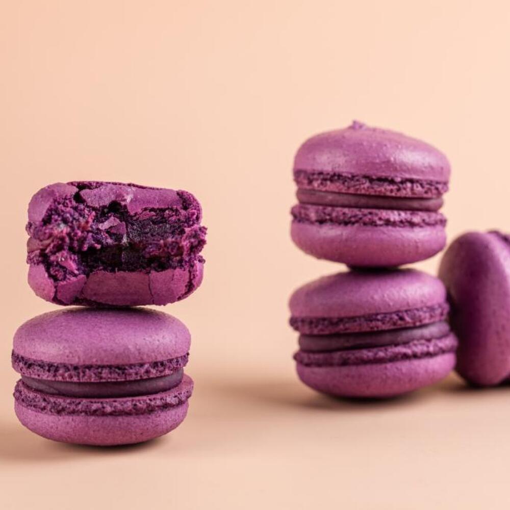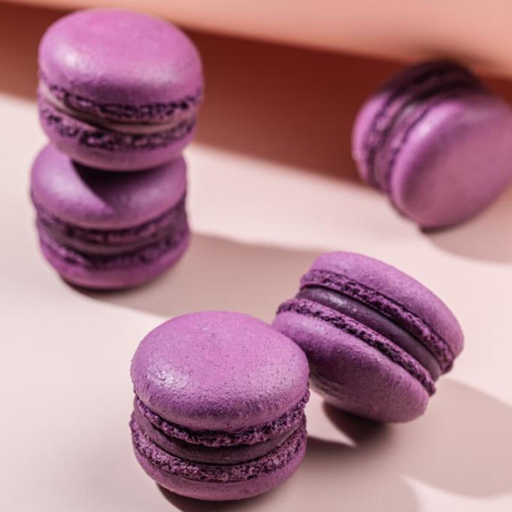 Миндальная мука, яичный белок, сахар, сахарная пудра. Начинка: Черная смородина- белый шоколад, пюре из черной смородины, в центре конфи из черной смородины. Крем-брюле- сливки, кофе, пряности.
