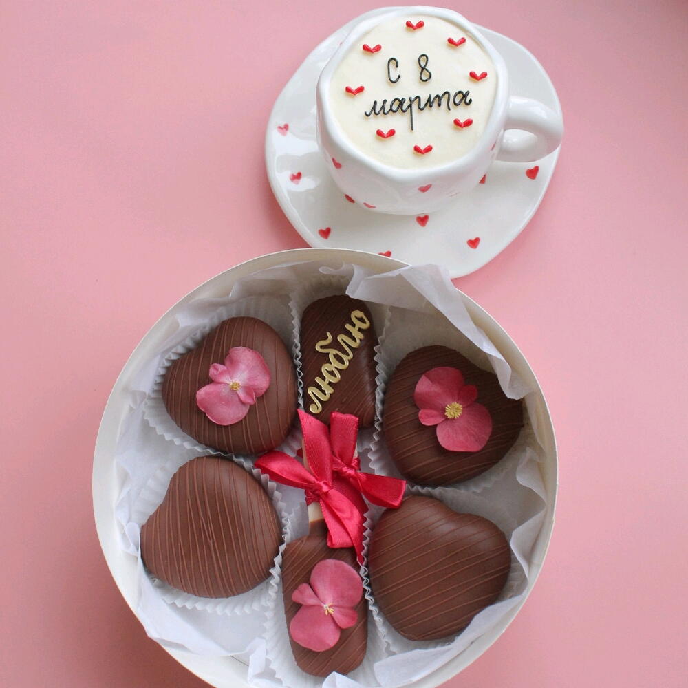 Сладкий подарочный набор на 8 марта (торт в чайной паре и набор пирожных) Начинка для торта в чайной паре на выбор Сердечки - пирожное "картошка". Эскимо - шоколадный мусс с кусочками шоколада При желании к заказу можем добавить открытку