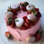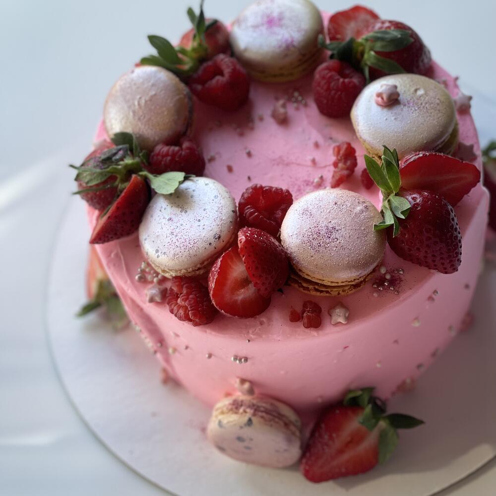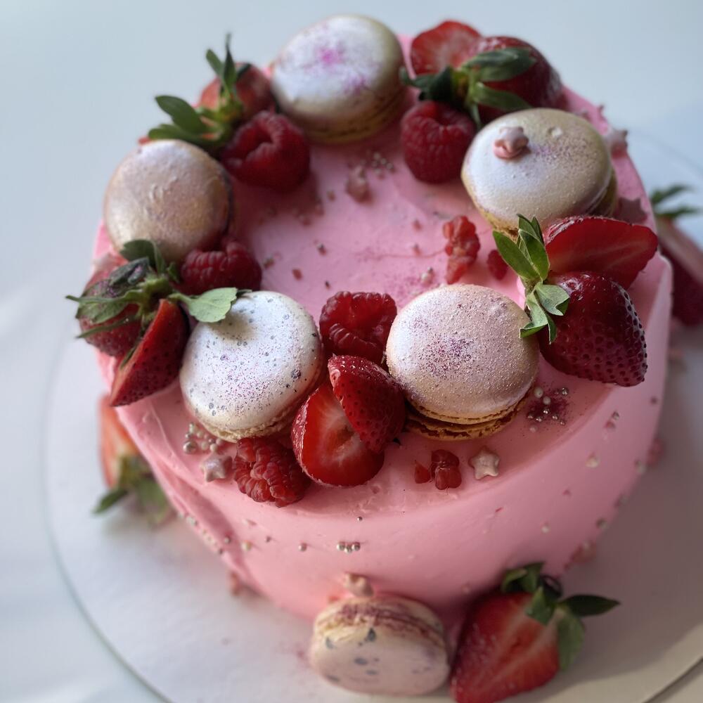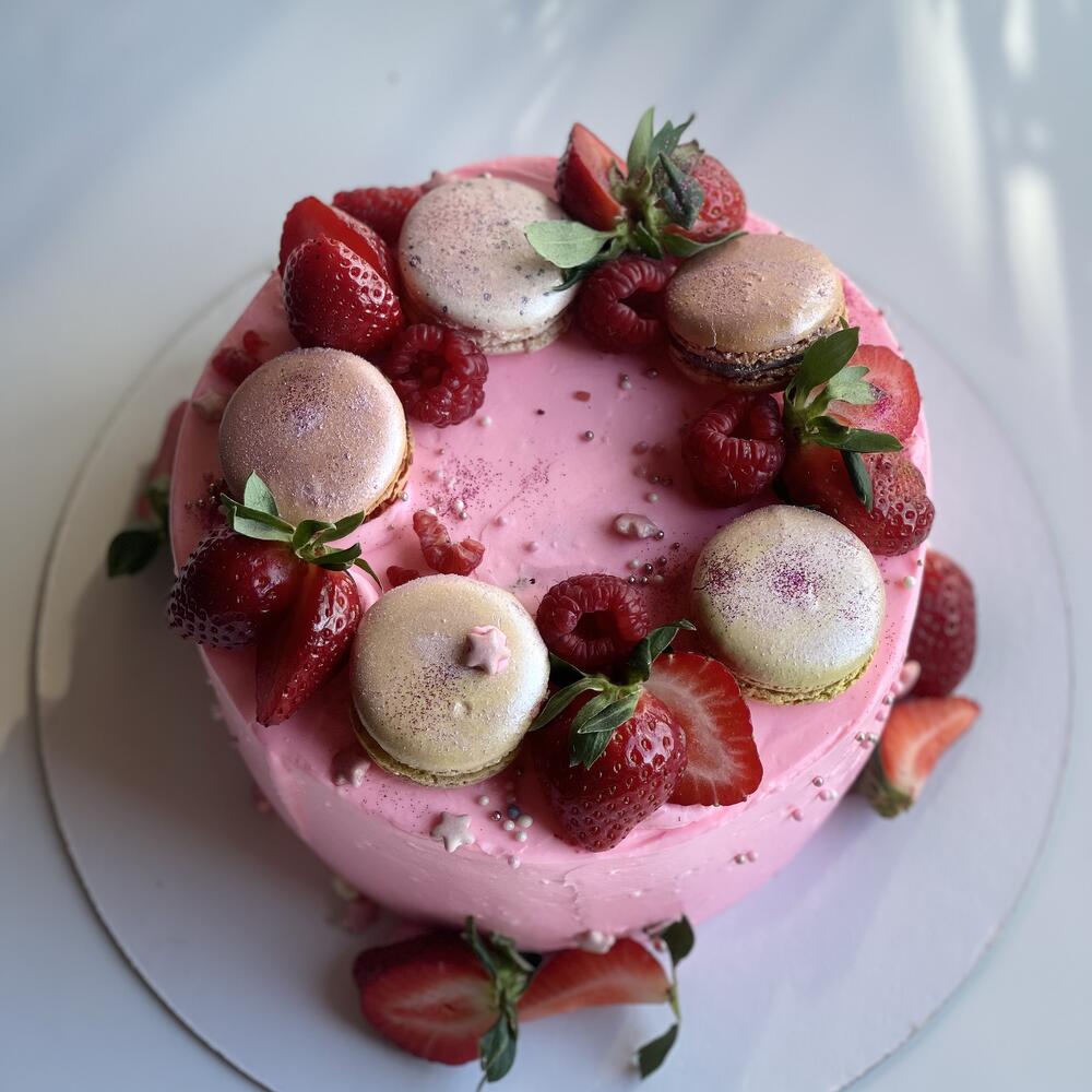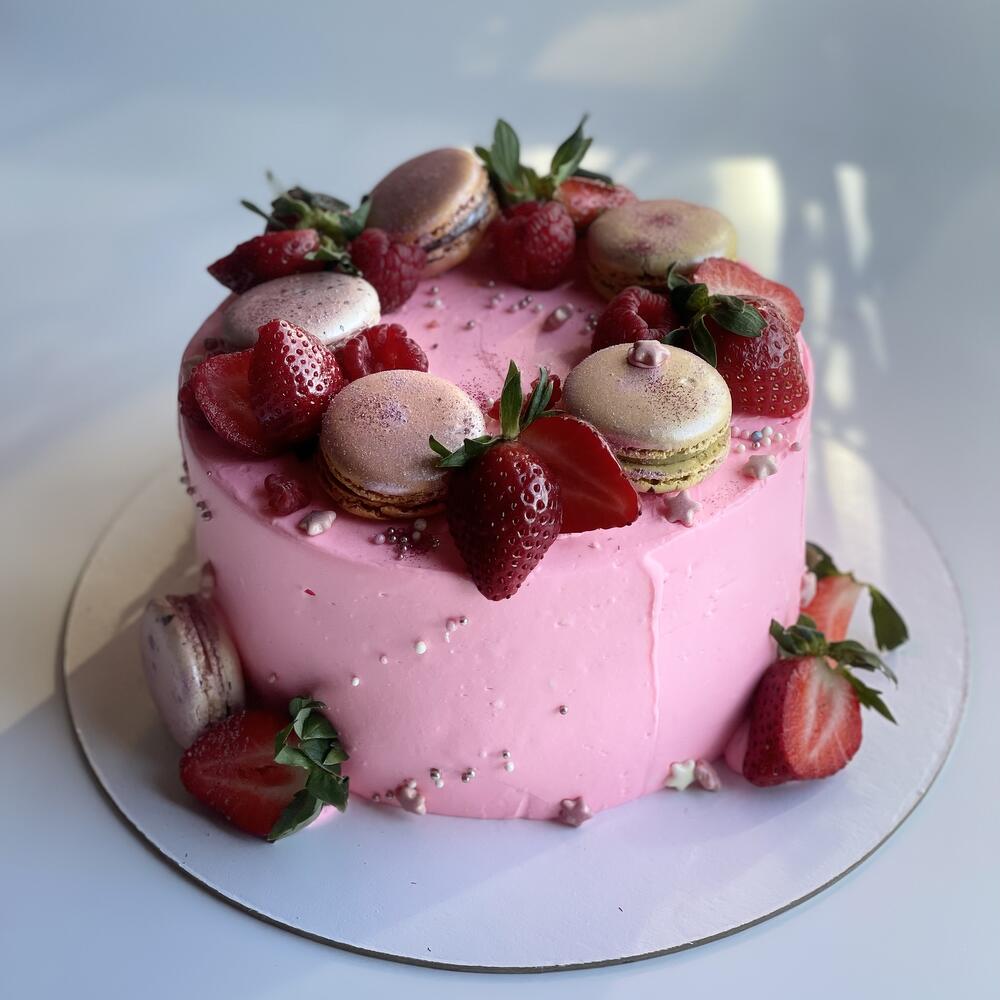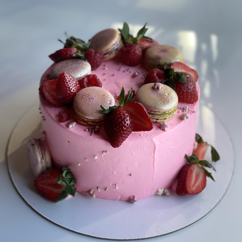 Торт цвета барби с клубникой и макарунами
