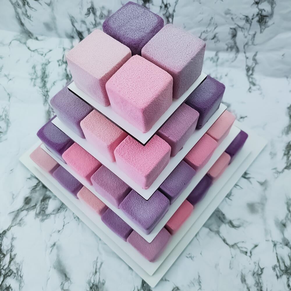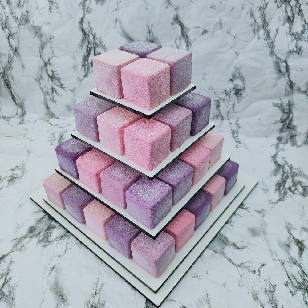 Порционный четырехъярусный муссовый торт. Отлично подойдет для свадьбы, корпоратива, выпускного или любого другого важного события. Торт состоит из 40 кубиков. Размер одного кубика 5*5*5см, вес около 110г. Ярусы вращаются вокруг своей оси. Количество кубиков может быть изменено от 44 до 56, за счет увеличения нижнего яруса. При добавлении еще одного яруса количество кубиков можно сделать от 60 до 72 штук. Дизайн, цвет, декор, могут быть изменены по договоренности. Возможно выбрать несколько вкусов. Пожалуйста, перед заказом уточняйте какие вкусы есть в наличии. 1. Вишня в шоколаде. Мусс на темном шоколаде, сливочный баваруаз с шоколадной крошкой, конфи вишня, шоколадный бисквит. 2. Клубника-лайм-базилик. Мусс на белом шоколаде, конфи клубника, креме лайм-базилик, ванильный бисквит. 3. Тео Малина. Мусс на молочном шоколаде, сливочный баваруаз с шоколадной крошкой, конфи малина, шоколадный бисквит. 4. Шоколадный мандарин. Мусс на темном шоколаде, кули мандарин, креме маракуйя, шоколадный бисквит. 5. Манго-маракуйя. Мусс на основе белого шоколада и манго, конфи манго-маракуйя, креме маракуйя, ванильный бисквит. 6. Малина-фисташка. Малиновый конфи, малиновый креме, мусс на основе нежного крем-чиза и фисташки, фисташковый бисквит. 7. Малиновое наслаждение. Мусс на молочном шоколаде, конфи малина, малиновый креме, шоколадный бисквит. 8. Абрикос. Мусс на основе сливочного крем-чиза, кули абрикос, креме абрикос, ванильный бисквит. 9. Карамельная груша. Карамельный мусс, конфи груша, фундучный бисквит. 10. Яблоко-фундук. Мусс на основе сливочного сыра и фундучного пралине, конфи яблоко-лимон, фундучный бисквит. 11. Кокос. Ананасовый кули, экзотический креме(маракуйя, ананас, кокос), кокосовый мусс, кокосовый дакуаз.