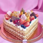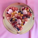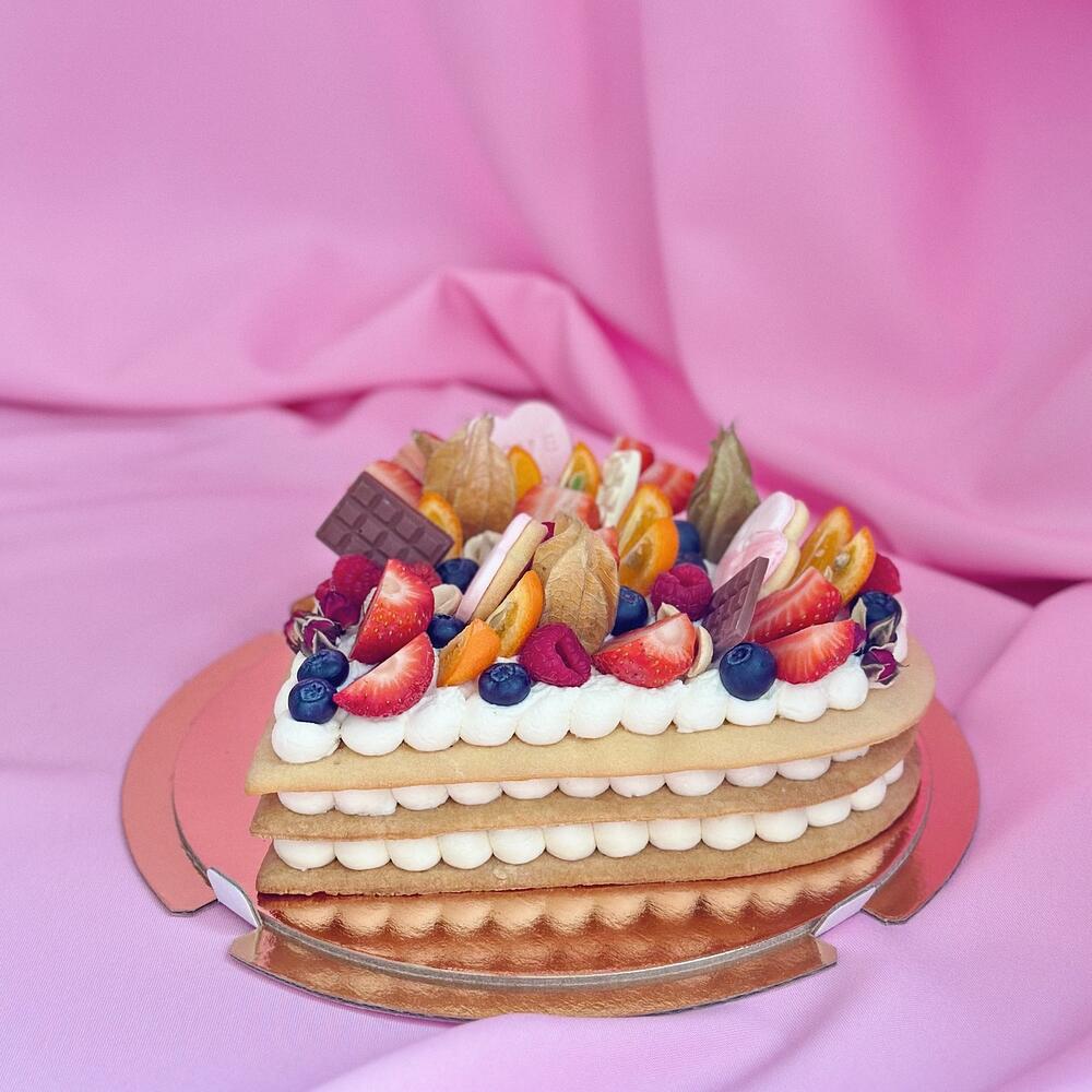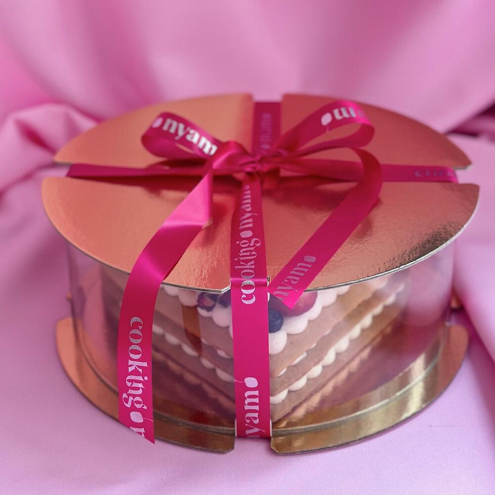 Медовые коржи (шоколадные), Сахар, яйца, ванильный сахар, сода, сливочное масло 82.5%, мед, какао, мука Крем чиз Творожный сыр, сливки натуральные 33%, сахарная пудра Начинка Ягодное конфи Ягоды