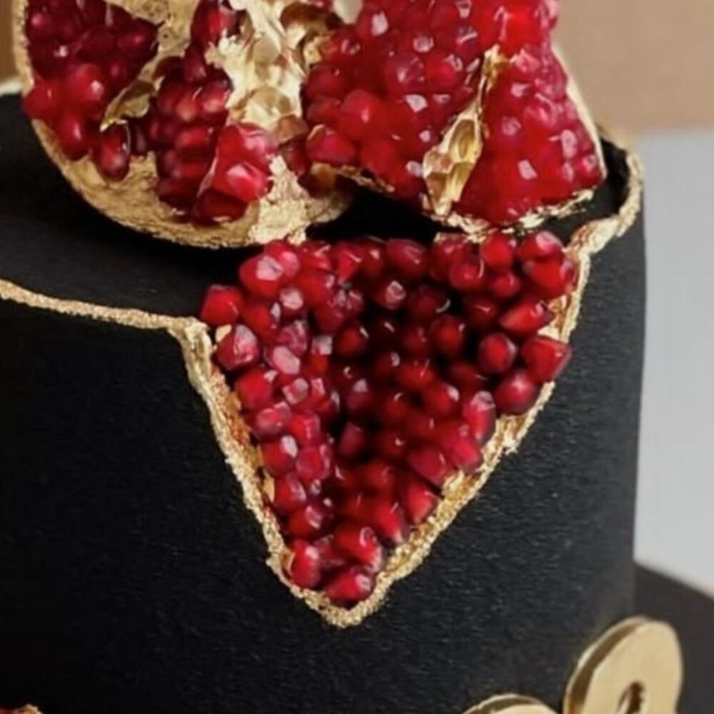 Мука, сахар, яйца, творожный сыр, сливки, сахарная пудра, шоколад, какао-масло, гранат