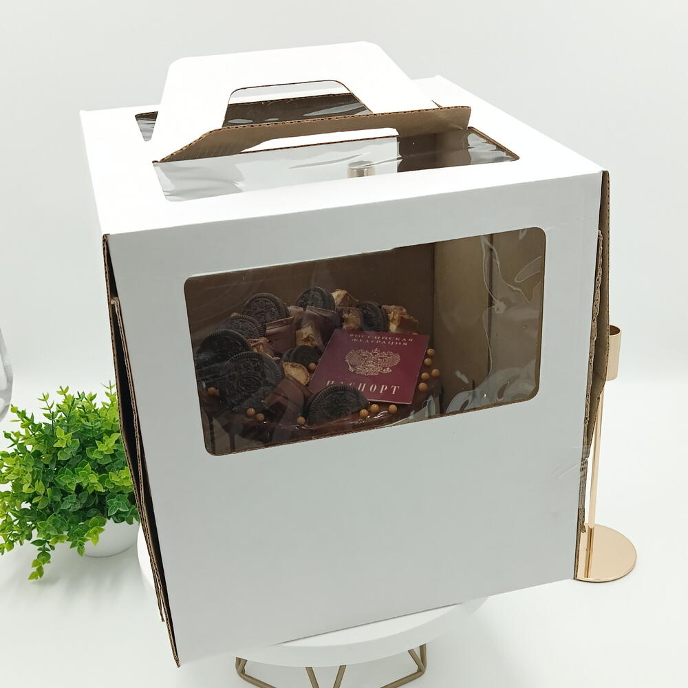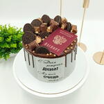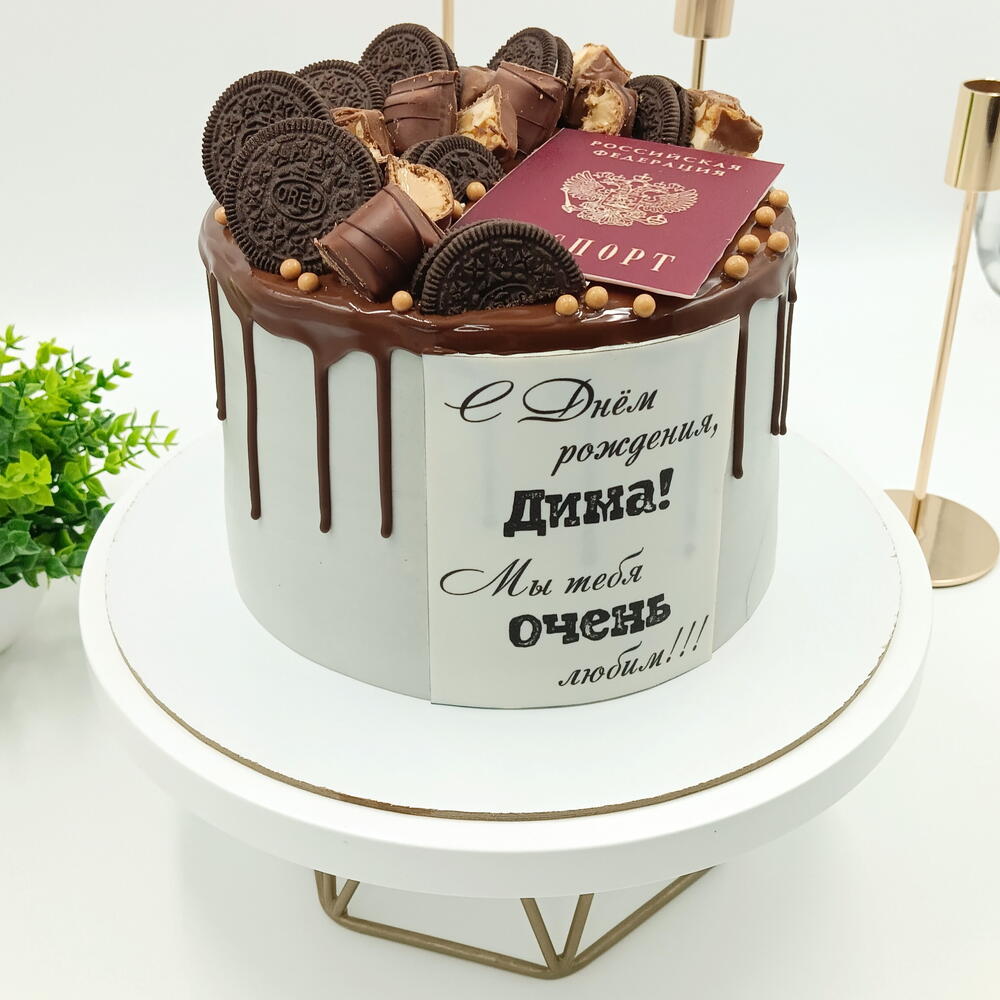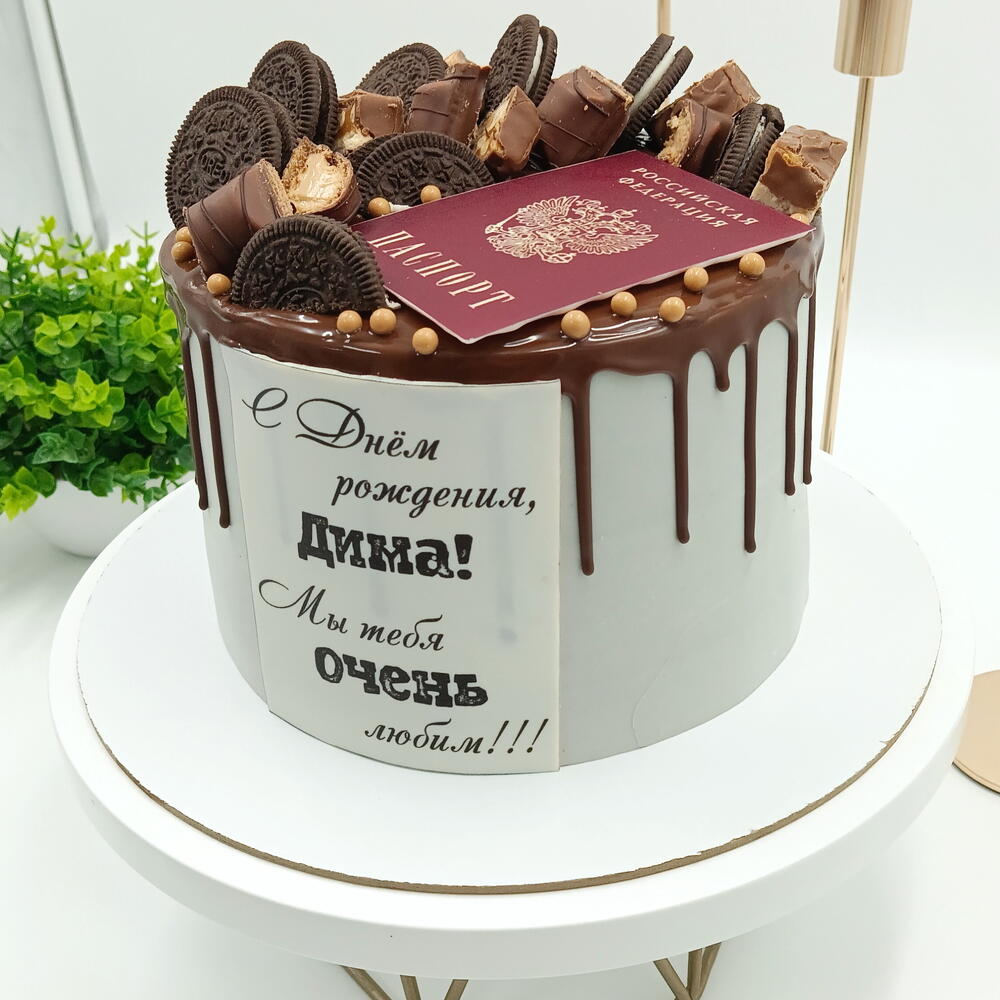 Праздничный торт, посвящённый четырнадцатилетию. Центральный элемент оформления — изображение паспорта на сахарной бумаге. Поверхность торта дополнена шоколадными подтёками и ассорти из шоколадок и печенья. Срок хранения в холодильнике 48 часов.