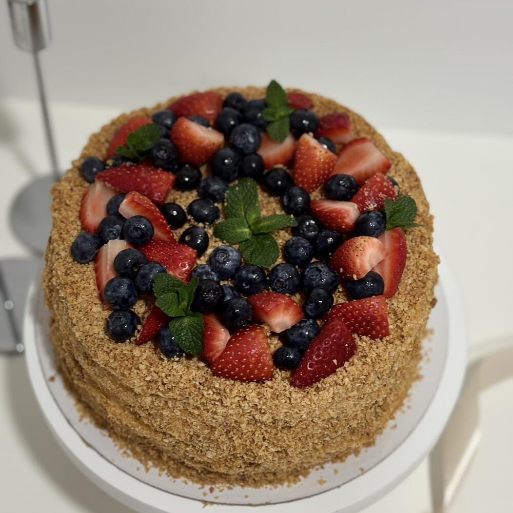Торт Напалеон с ягодами и кремом Намелака.Песочные коржи покрыты легким ванильным кремом Намелака.Крем на основе сливок.Легкая текстура крема соединяет песочные коржи.Очень нежный тортик с ягодами клубники ,голубики подойдет на любое чаепитие ,праздник .
