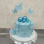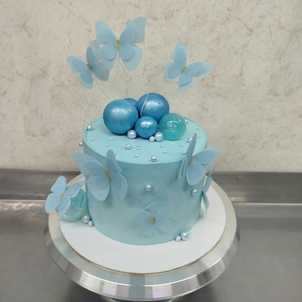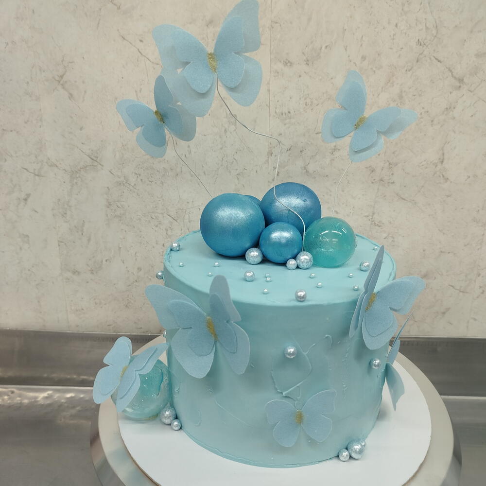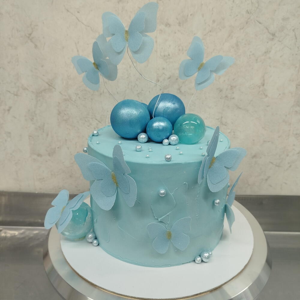 Эффектный торт с голубыми бабочками будет отличным подарком к празднику. Декор - бабочки из вафельной бумаги, в украшении использованы сферы из кондитерского шоколада и прозрачные сферы карамели, посыпка из воздушного риса.