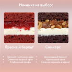 Красный бархат: мука, разрыхлитель, краситель красный, какао, яйца, молоко, растительное масло, творожный сыр, слив. масло, сахарная пудра, ваниль, клубника, сахар, крахмал кукурузный, вода Сникерс: мука, разрыхлитель, какао, сахар, яйца, молоко, растительное масло, соль, вода, слив. масло, арахис, творожный сыр, вареная сгущенка, сливочное масло