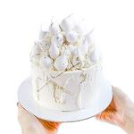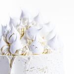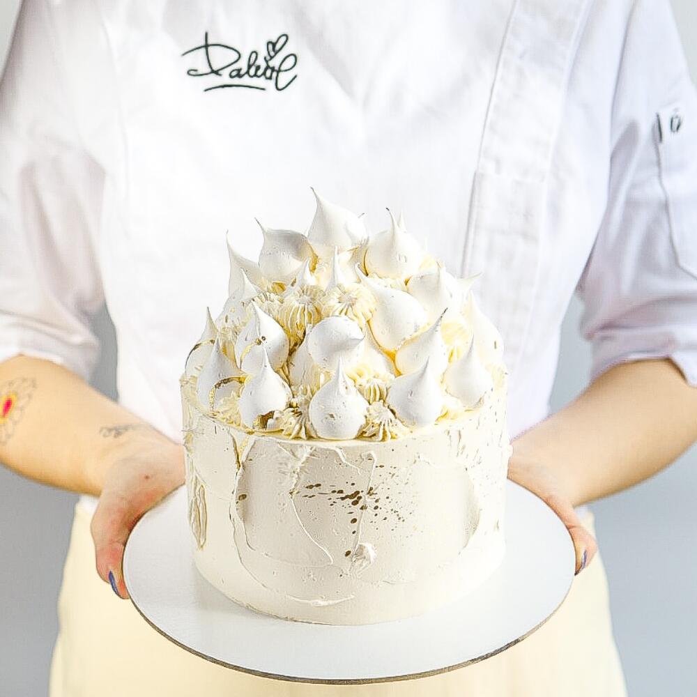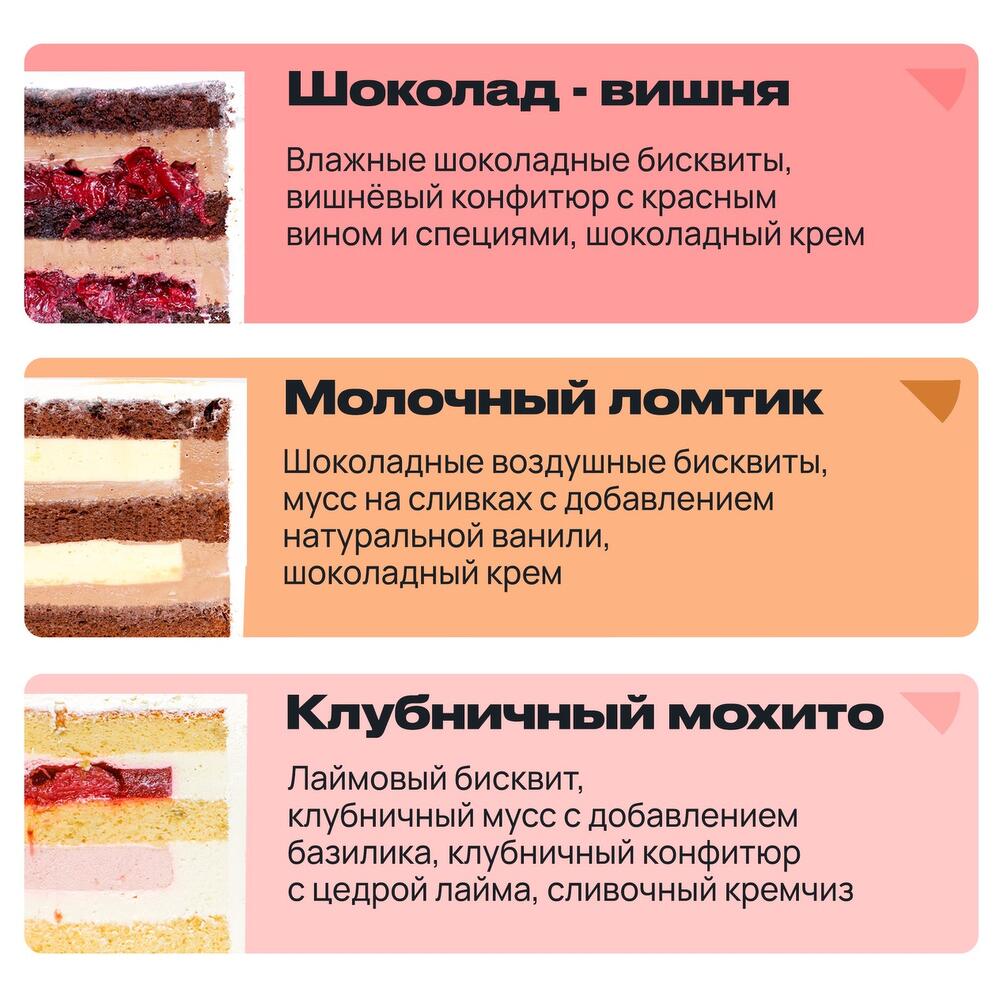1. Шоколад-пряная вишня Влажные шоколадные бисквиты, вишнёвый конфитюр с красным вином и специями, шоколадный крем. Состав: молоко, сливочное масло, растительное масло, сахар, какао, мука, яйца, сода, разрыхлитель, темный шоколад, молочный шоколад, сливки 33%, вишня, красное вино, кардамон, кориандр, корица, имбирь, мускатный орех, кукурузный крахмал. 2. Клубничный мохито Лаймовый бисквит, клубничный мусс с добавлением базилика, клубничный конфитюр с цельной ягодой и цедрой лайма, сливочный кремчиз. Состав: Мука, сахар, яйца, сливочное масло, цедра лайма, творожный сыр, сахарная пудра, сливки 33%, базилик, клубника. 3. Молочный ломтик Шоколадные воздушные бисквиты, мусс на сливках с добавлением натуральной ванили, шоколадный крем. Состав: мука, сахар, яйца, сливочное масло, какао, молочный шоколад, темный шоколад, сливки 33%, молоко, ванильная паста. Белоснежный торт украшен горкой из итальянских меренг (безе) и золотыми брызгами кандурина. Покрытие торта из белково-масляного крема. Состав: сливочное масло, яичный белок и сахар.
