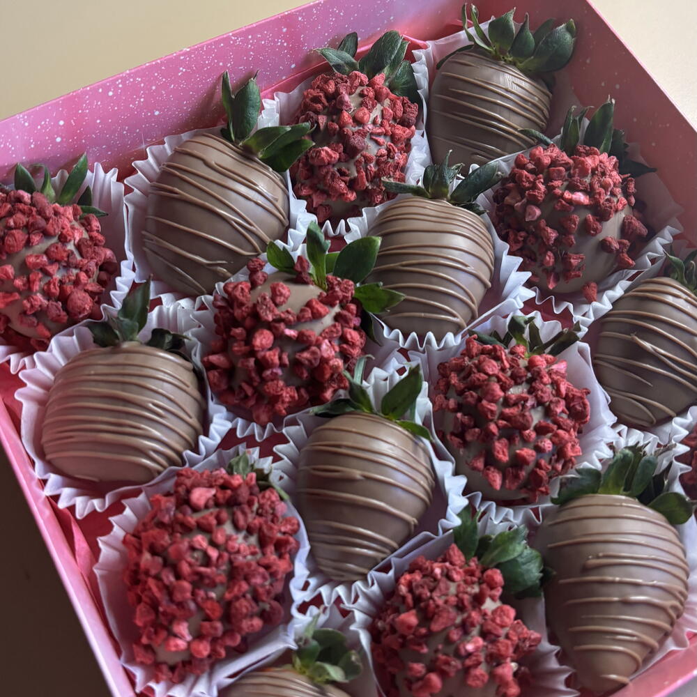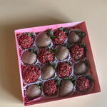 •Бельгийский шоколад Callebaut (сахар, масло какао, сухое цельное молоко, какао тертое, эмульгатор: соевый лецитин, натуральный ароматизатор:ваниль) •Ягоды клубники 16 шт •Сублимированная малина •Подарок