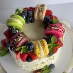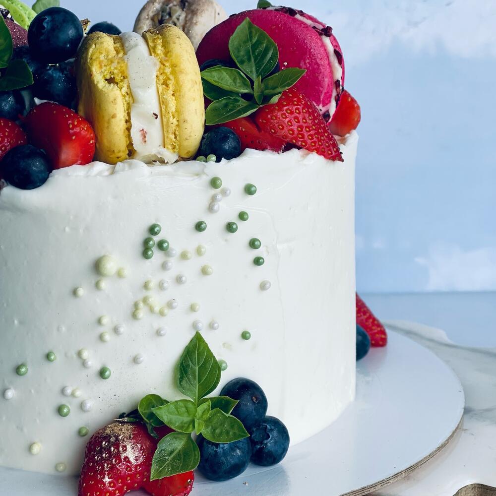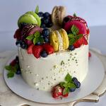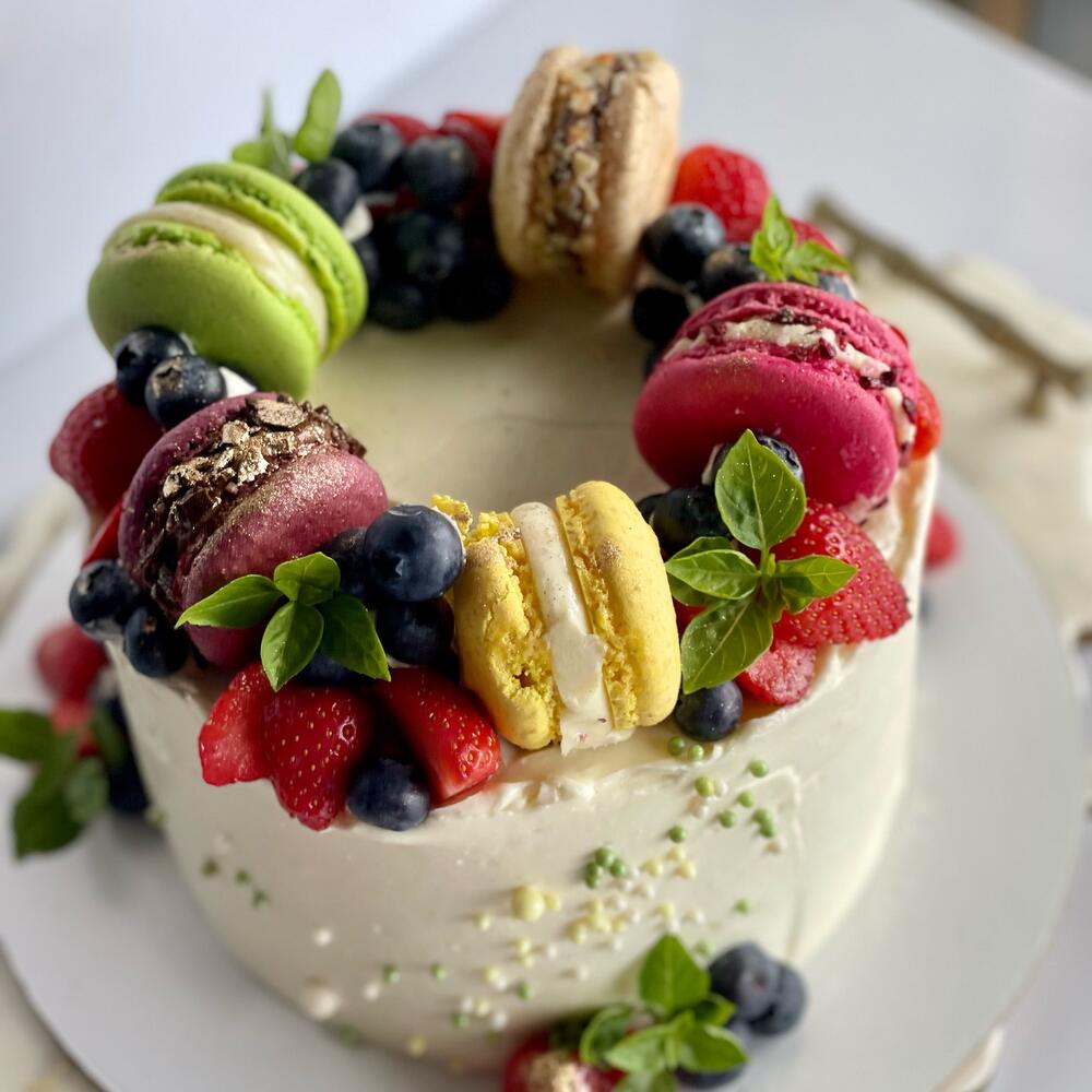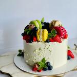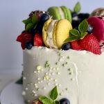 Сочный и яркий торт с ягодами - идеальный десерт на любой праздник! Торт подойдет как мужчине, так и девушке, ребенку, будь то день рождения или просто знаменательная дата! Торт декорирован свежими ягодами клубники и голубики, зеленью и французскими пирожными - макаронами с разными вкусами. По вашему желанию мы можем изменить цвет торта и сделать его вашим любимым ( например, не былым, а желтым , розовым и тд ) также возможно сделать торт большего размера ( при заказе заранее ). К этому торту вы можете приобрести у нас наборы капкейков, макароны или безалкогольное шампанское)