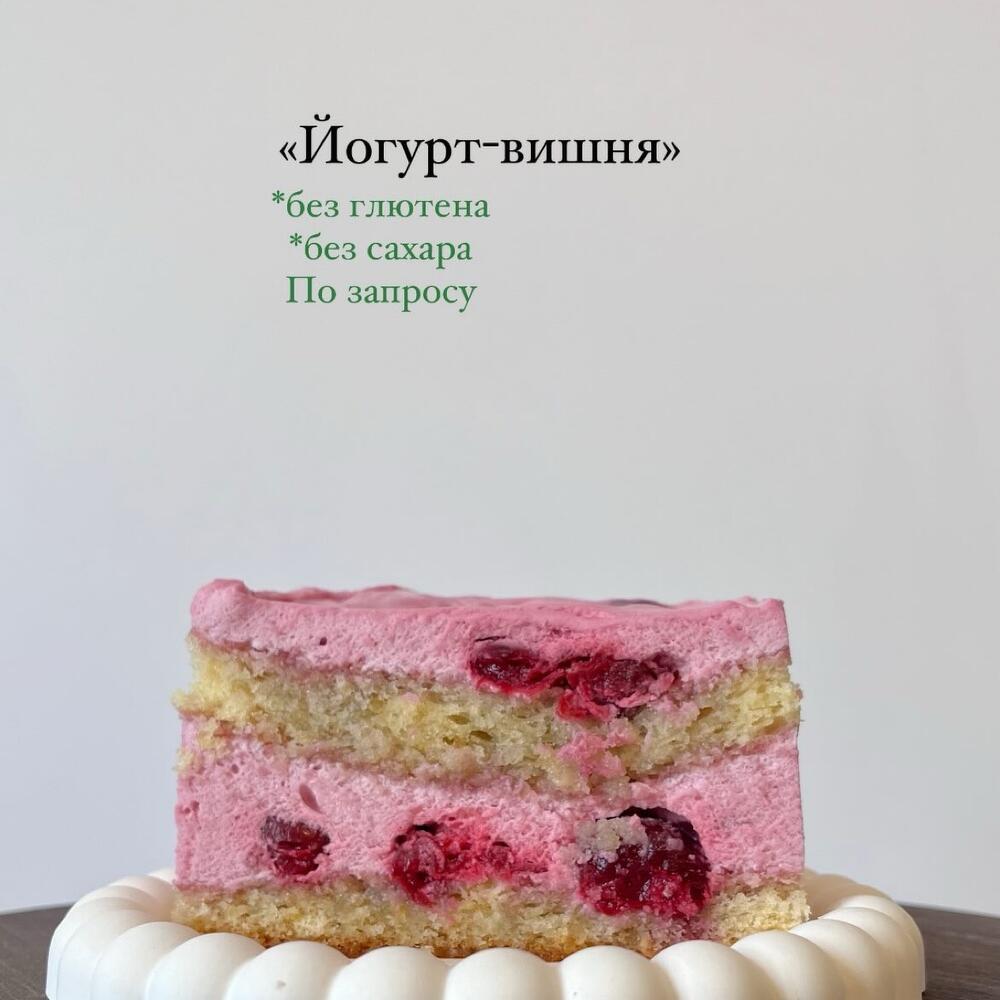 ванильный бисквит, мусс на основе натурального йогурта с кусочками вишни