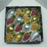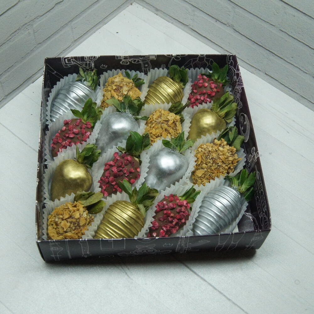 Шоколад молочный Sicao ( Barry Callebaut) Состав: Сахар, масло какао, сухое цельное молоко, какао тёртое, сухая молочная сыворотка, молочный жир, эмульгатор: соевый лецитин, ароматизатор ванилин, эмульгатор Е476. Клубника свежая, (16-25шт) В зависимости от размера клубники Сублимированная малина Пищевой блеск, золото Пищевой блеск серебро Посыпка вафельная крошка Бельгия Упаковка Коробочка с крышкой 20×20×5 Пакет