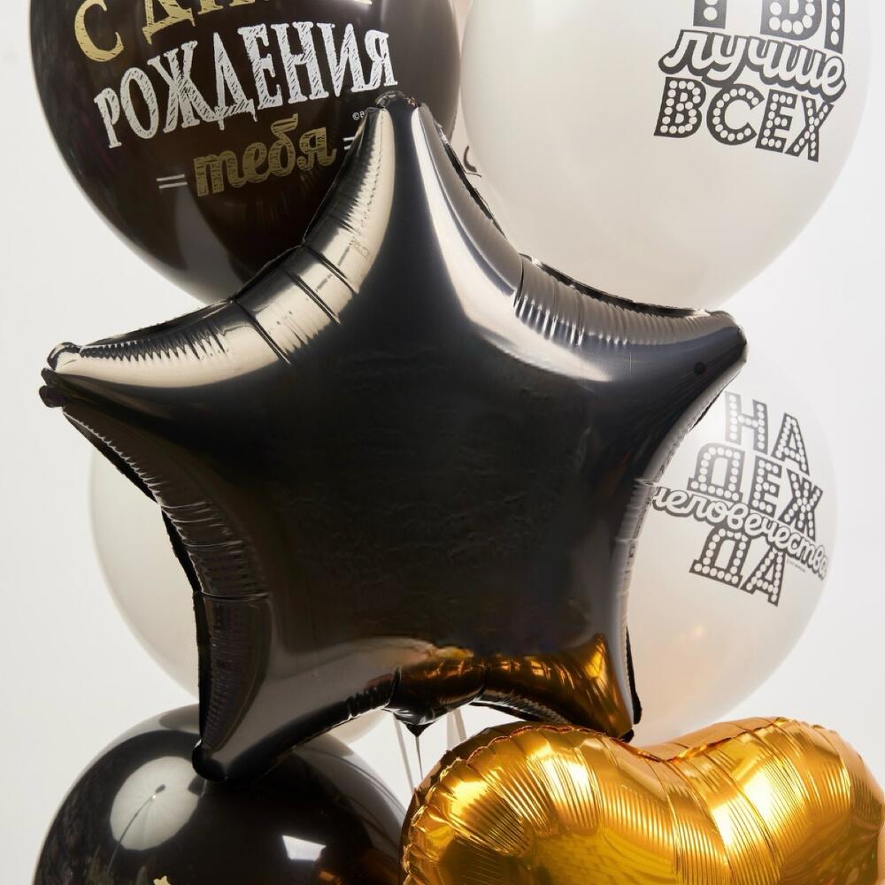 Букет шаров для настоящего мужчины. Благородный цвет и удивительная тематика послужит ярким и запоминающимся подарком. Все наши букеты мы обрабатываем профессиональным герметиком HI-FLOAT, который максимально продлевает полет Ваших шаров. В подарок к букету идет грузик в форме звездочки (цвет грузика может отличаться).