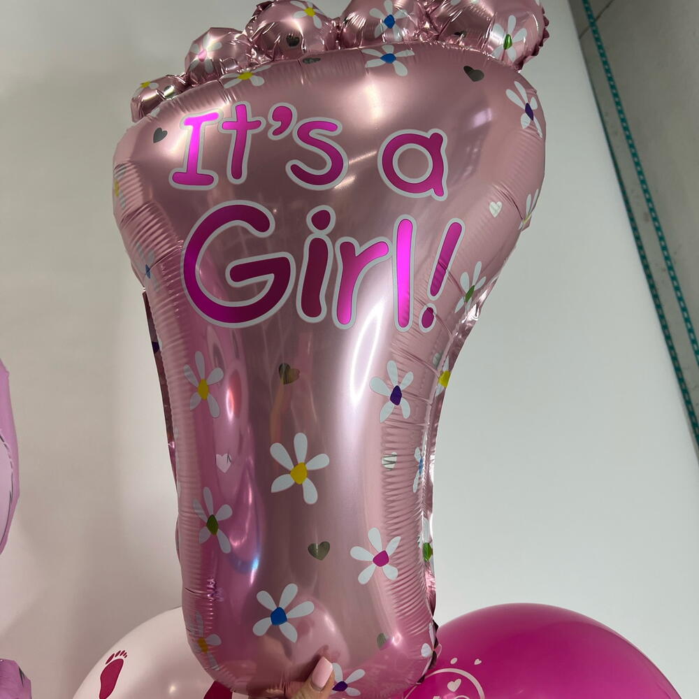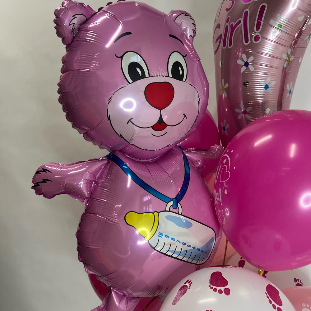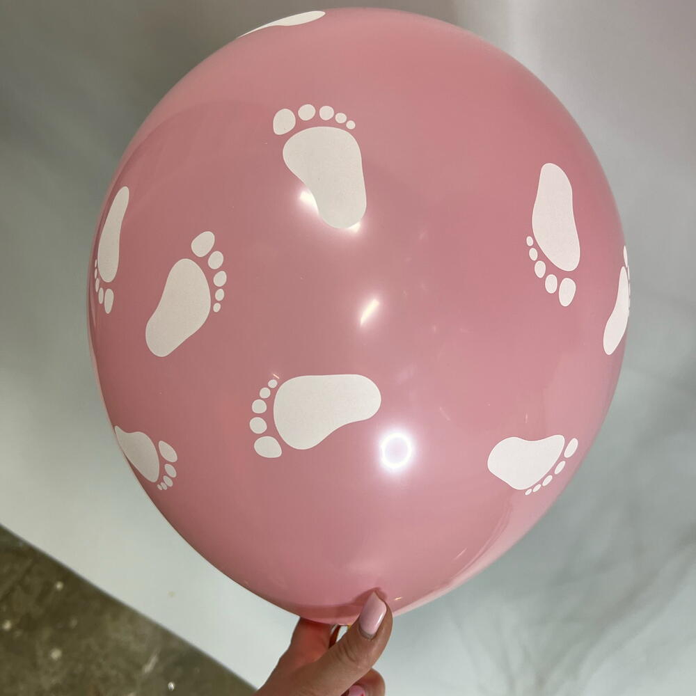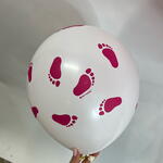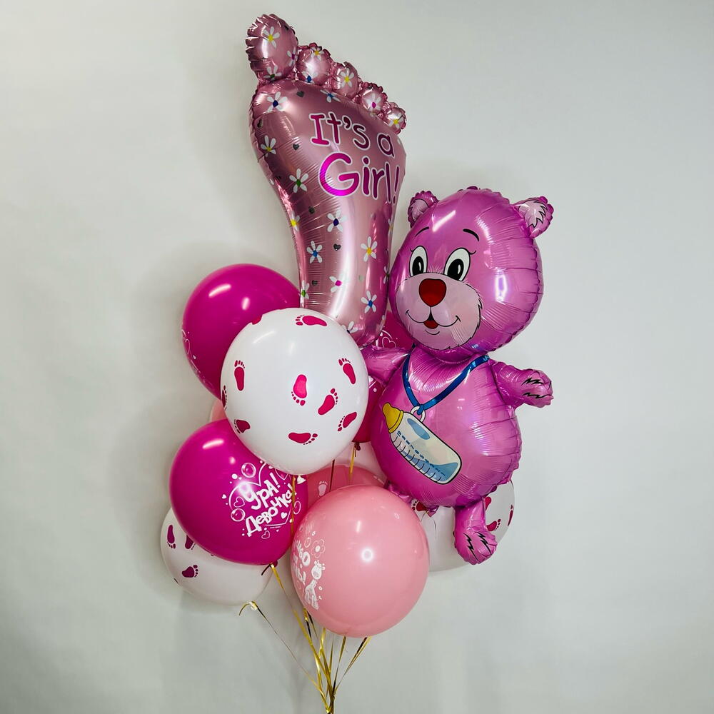 3 латексных фуксия с рисунком Спасибо за дочь, 5 латексных с рисунком Детские пяточки (3 белых, 2 розовых), фигура Стопа розовая, фигура Медвежонок девочка.