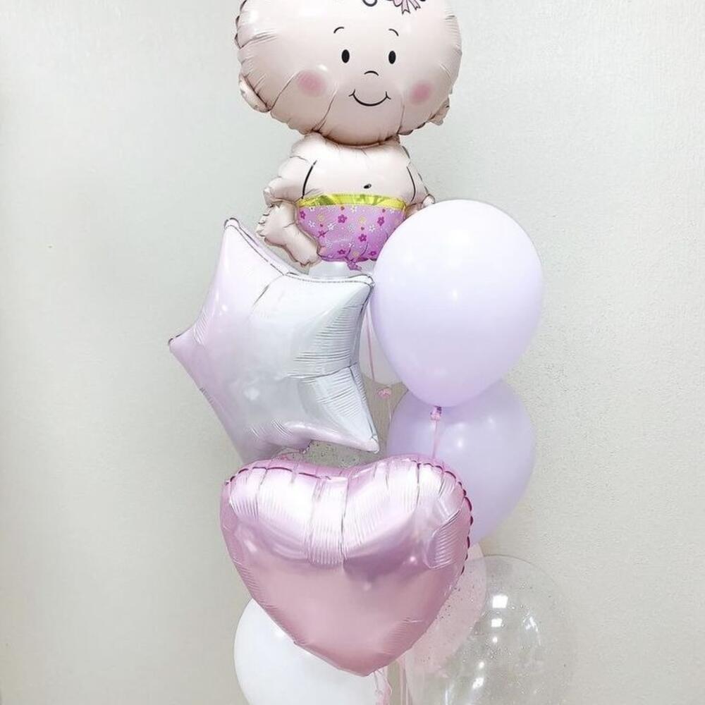 В стоимость входит: - 1шт шар фигура малыш девочка, 76 см - 1шт шар фигура сердце, 46см. - 1шт шар фигура звезда, 46см. - 5шт латексный шар пастель 35см. - 2шт латексный шар кристалл 35см., с конфетти - 1шт грузик *заказ будет доставлен в плотном прозрачном пакете для транспортировки
