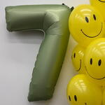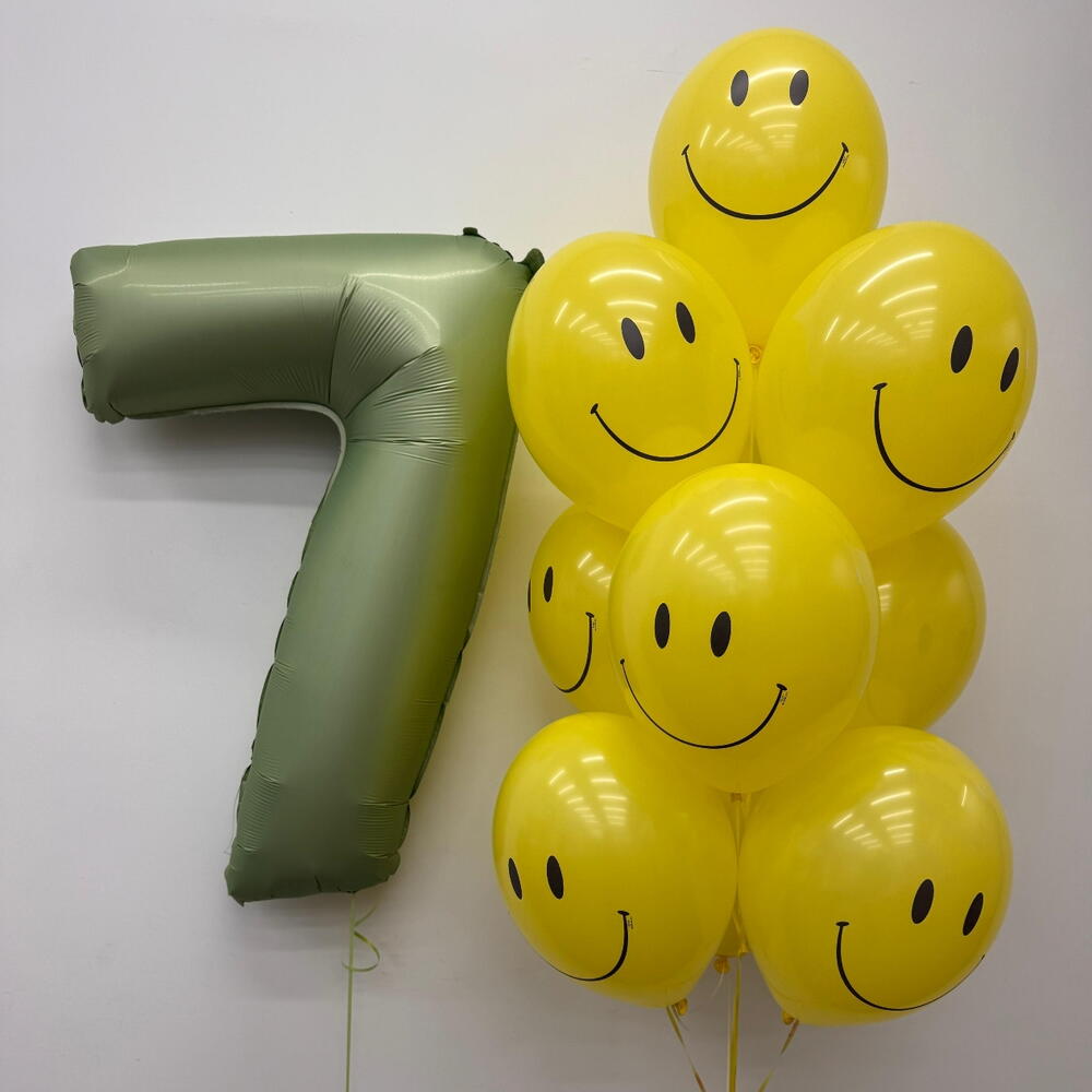 Состав сета: - фольгированная цифра оливковый сатин 102 см - 1 шт Фонтан из 10 шаров: - латексный шар 35 см с принтом Улыбка - 10 шт
