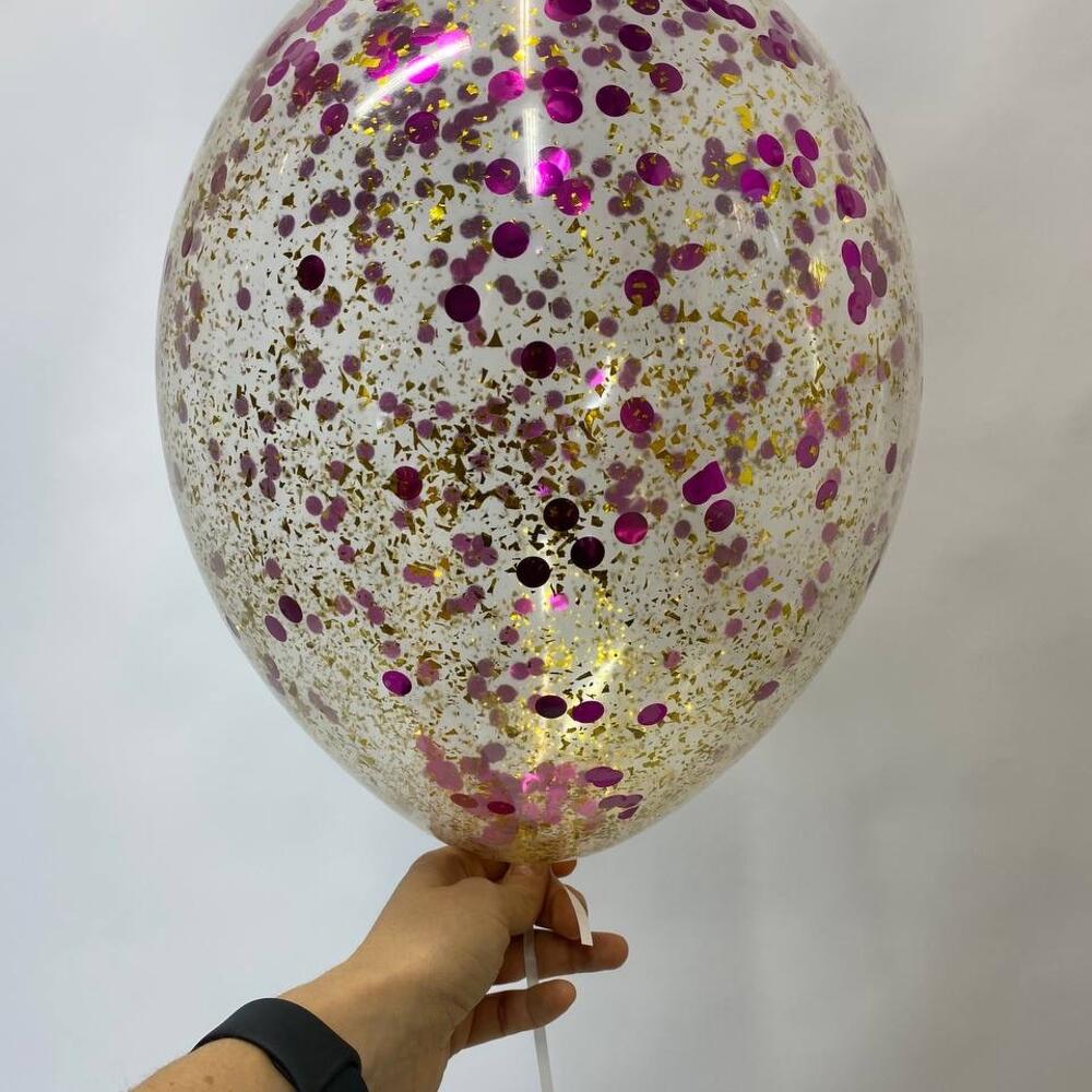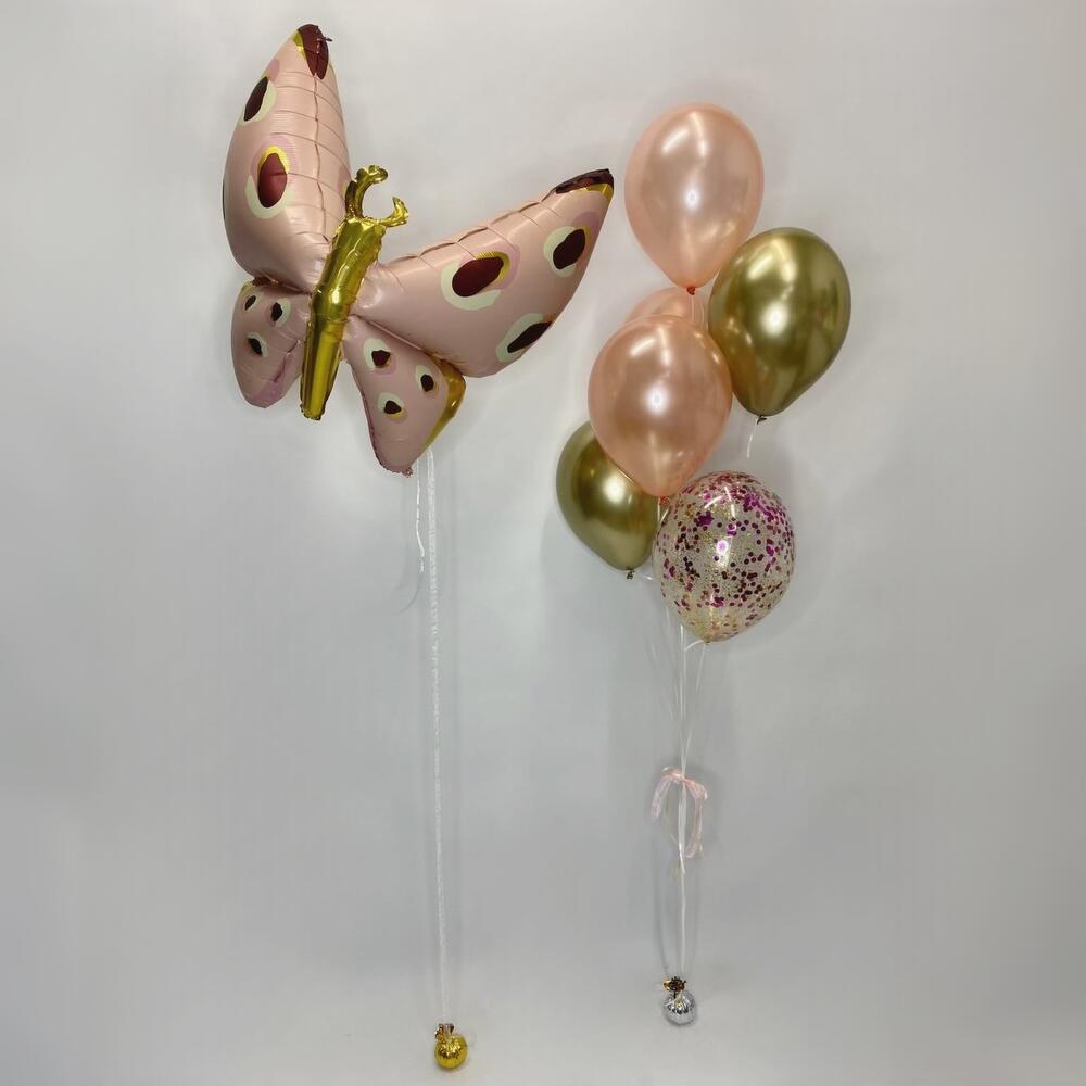 фонтан из 6 латексных 30 см (3 розовое золото, 2 золото хром, 1 прозрачный с ассорти конфетти). Фигура Бабочка розовая с усиками.