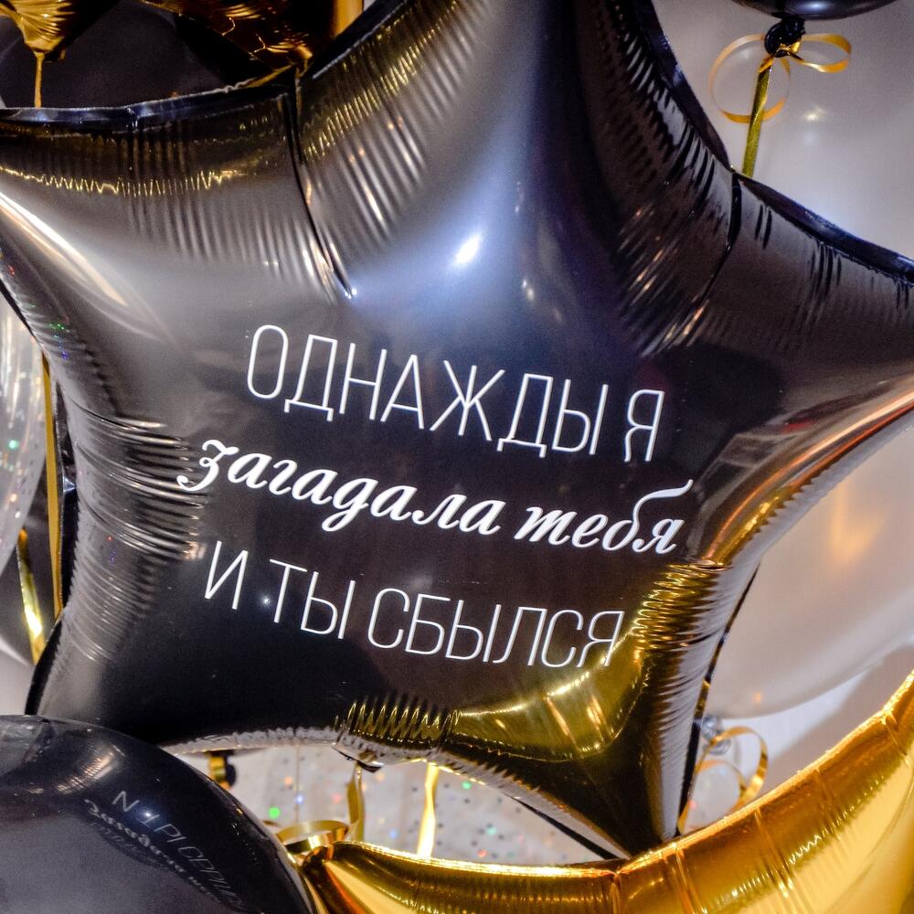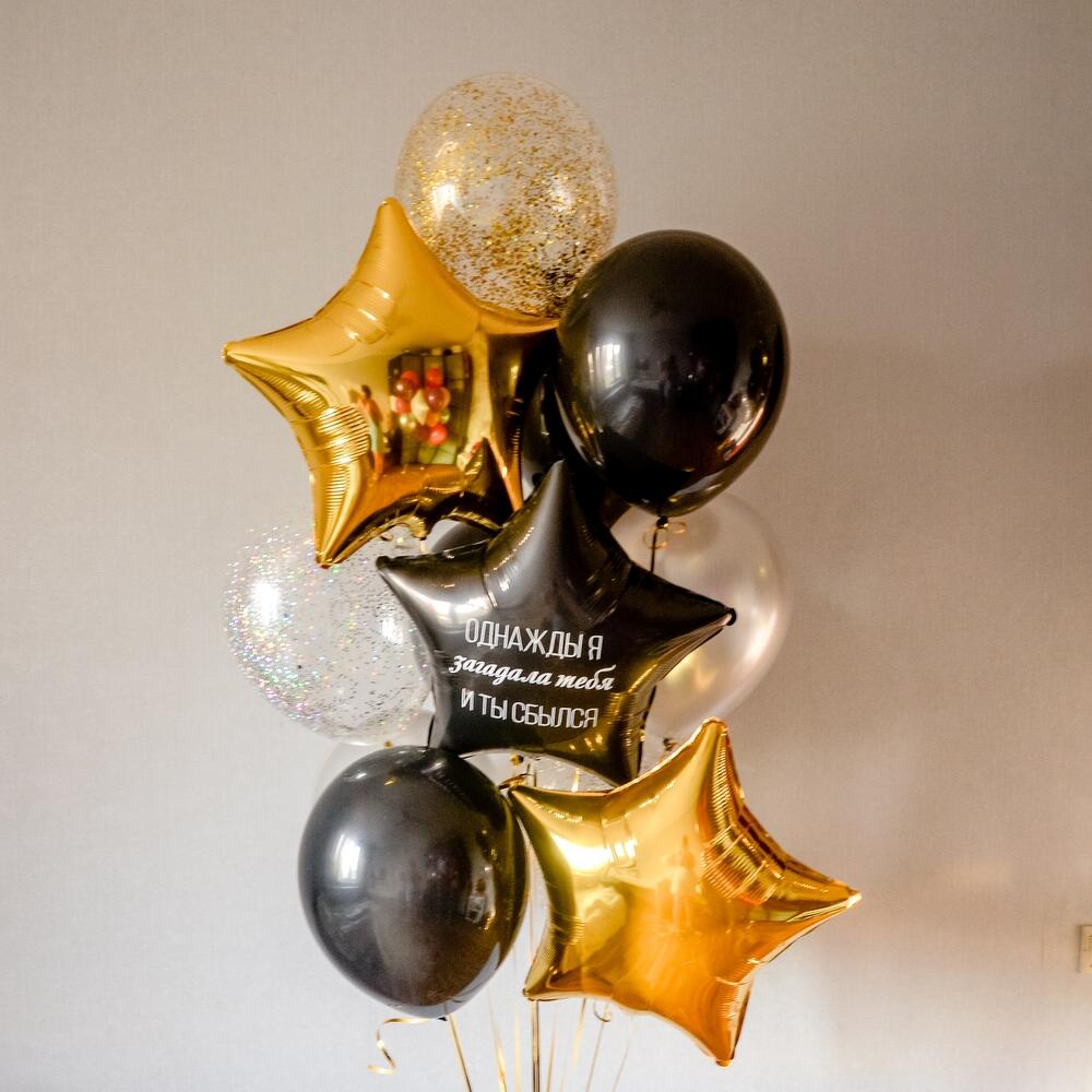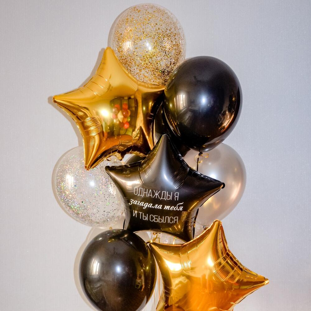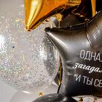 Состав 4 черных латексных шарика (12"/30 см) 4 серебрянных латексных шарика (12"/30 см) 2 шарика с конфетти (12"/30 см) 2 фольгированные звезды (18"/45 см) 1 фольгированая звезда с индивидуальной надписью (18"/45 см)