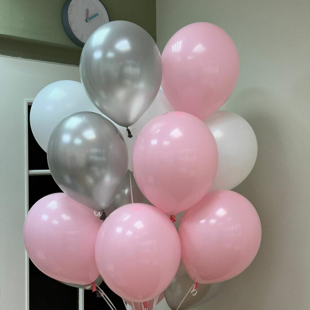 В набор входит 15 шариков: - 5 Латексных шариков металлик серебро. - 5 Латексных шариков пастель белый. - 5 Латексных шариков пастель розовый. - Специальный грузик. - Транспортировочный пакет